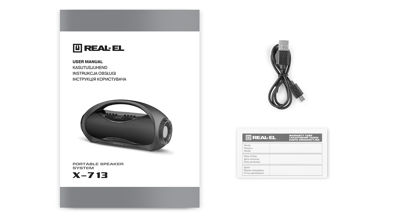 REAL-EL X-713 multimedia portable acoustic system features a modern design with high-quality sound. Its extensive functionality allows for music playback by connecting mobile devices, PCs, TVs, laptops, etc., both through an AUX output and via Bluetooth. USB and Micro SD card slots enable audio file playback from flash drives.