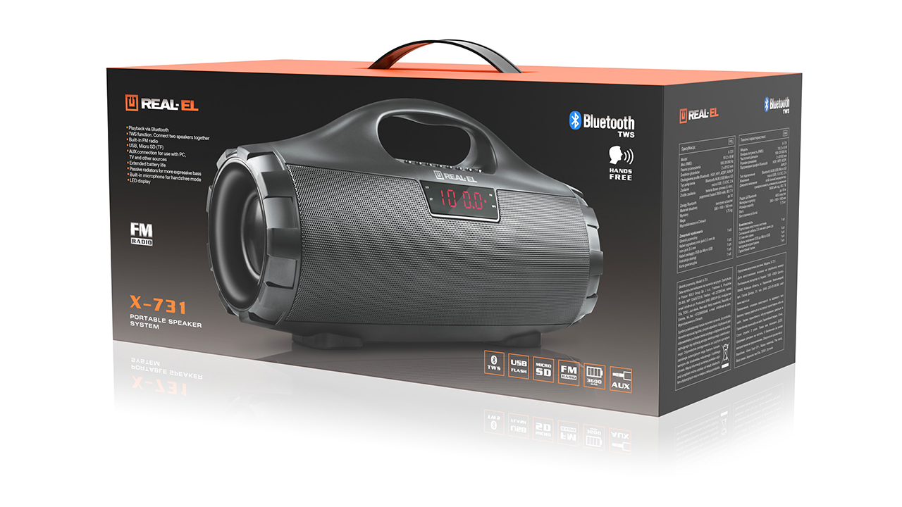 REAL-EL X-731 multimedia portable acoustic system features a modern design with high-quality sound. Its extensive functionality allows for music playback by connecting mobile devices, PCs, TVs, laptops, etc., both through an AUX output and via Bluetooth. USB and Micro SD card slots enable audio file playback from flash drives.