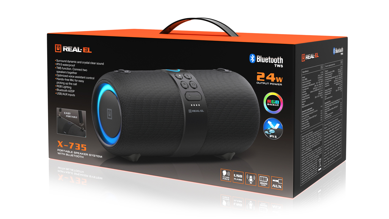 REAL-EL X-735 is an excellent companion for outdoor and street leisure in any weather, with IPX6 protection allowing for enjoyment even in the rain.