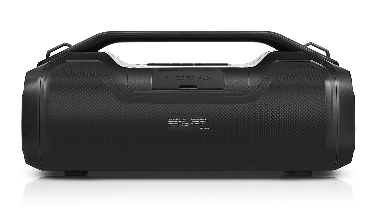 Вбудована акумуляторна батарея ємністю 3600 мАг pic Захист від потрапляння рідин 5-го класу pic Підключення за допомогою USB TYPE-C pic Різнокольорове підсвічування pic Відтворення з карт пам'яті MICRO SD pic Лінійний вхід AUX pic Вбудований еквалайзер pic Дозволяє працювати в режимі стерео двом окремими Bluetooth пристроям pic Підтримка технології Hands Free pic Вбудований мікрофон pic Вбудований Power Bank pic Вихідна потужність 50 Вт pic