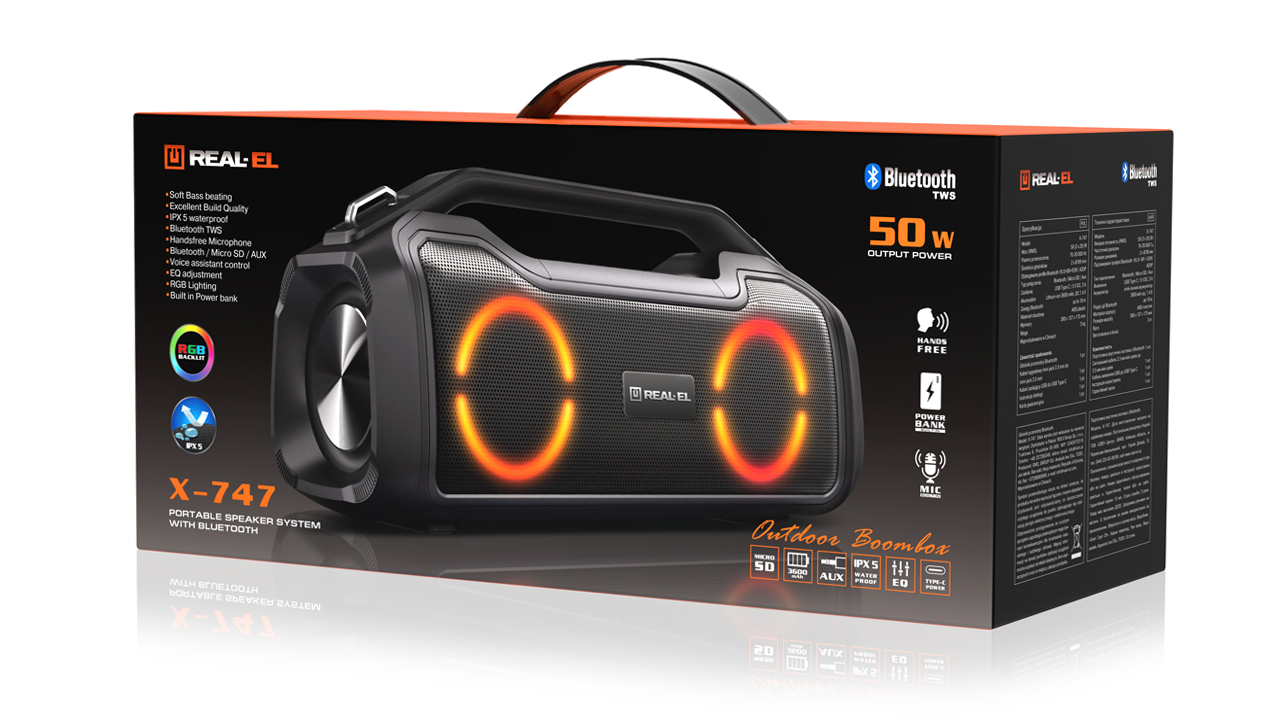 REAL-EL X-747 is an excellent companion for outdoor and street leisure in any weather. IPX5 protection allows for enjoyment even in the rain. The handy power bank feature is very timely for extended leisure and will keep you connected longer.