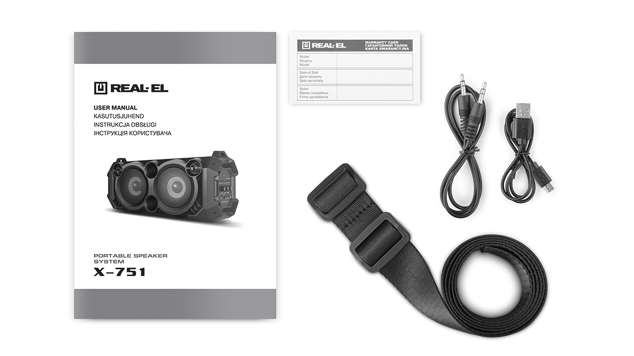 REAL-EL X-751 multimedia portable acoustic system features a modern design with high-quality sound. Its extensive functionality allows for music playback by connecting mobile devices, PCs, TVs, laptops, etc., both through an AUX output and via Bluetooth. USB and Micro SD card slots enable audio file playback from flash drives.