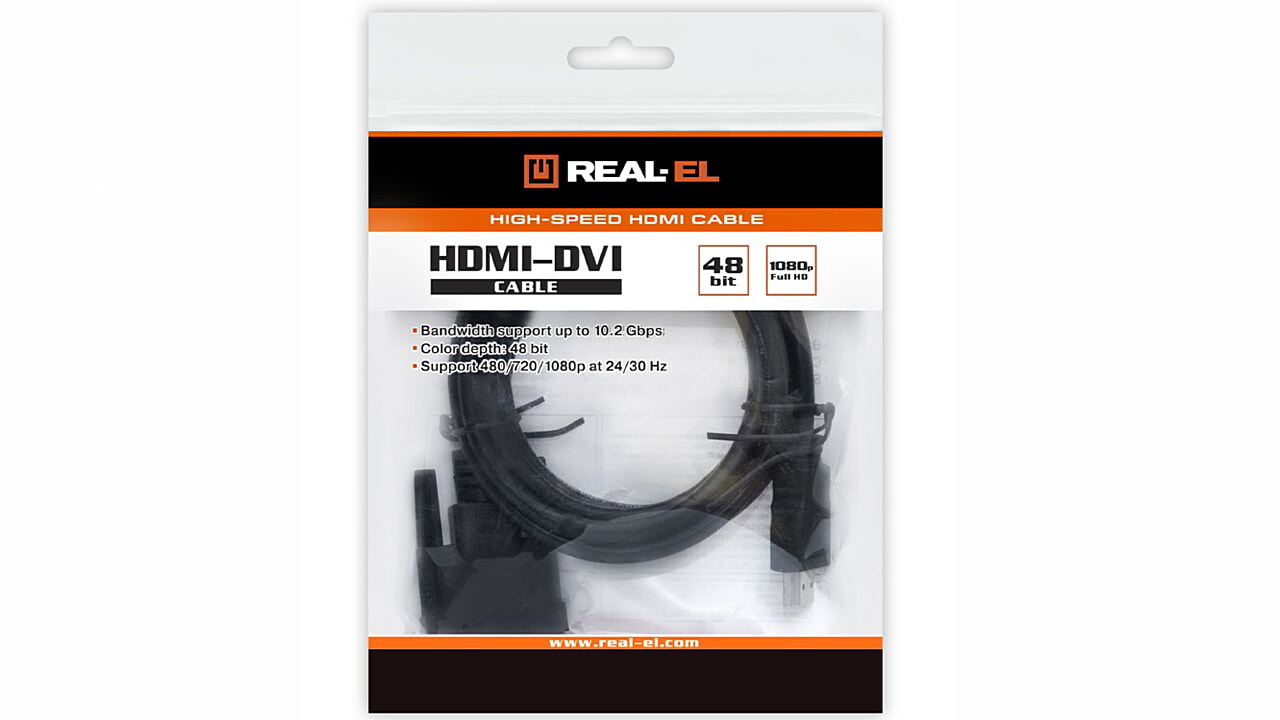 The REAL-EL HDMI-DVI M-M cable is designed to connect a signal source to a television or other devices with HDMI and DVI ports.