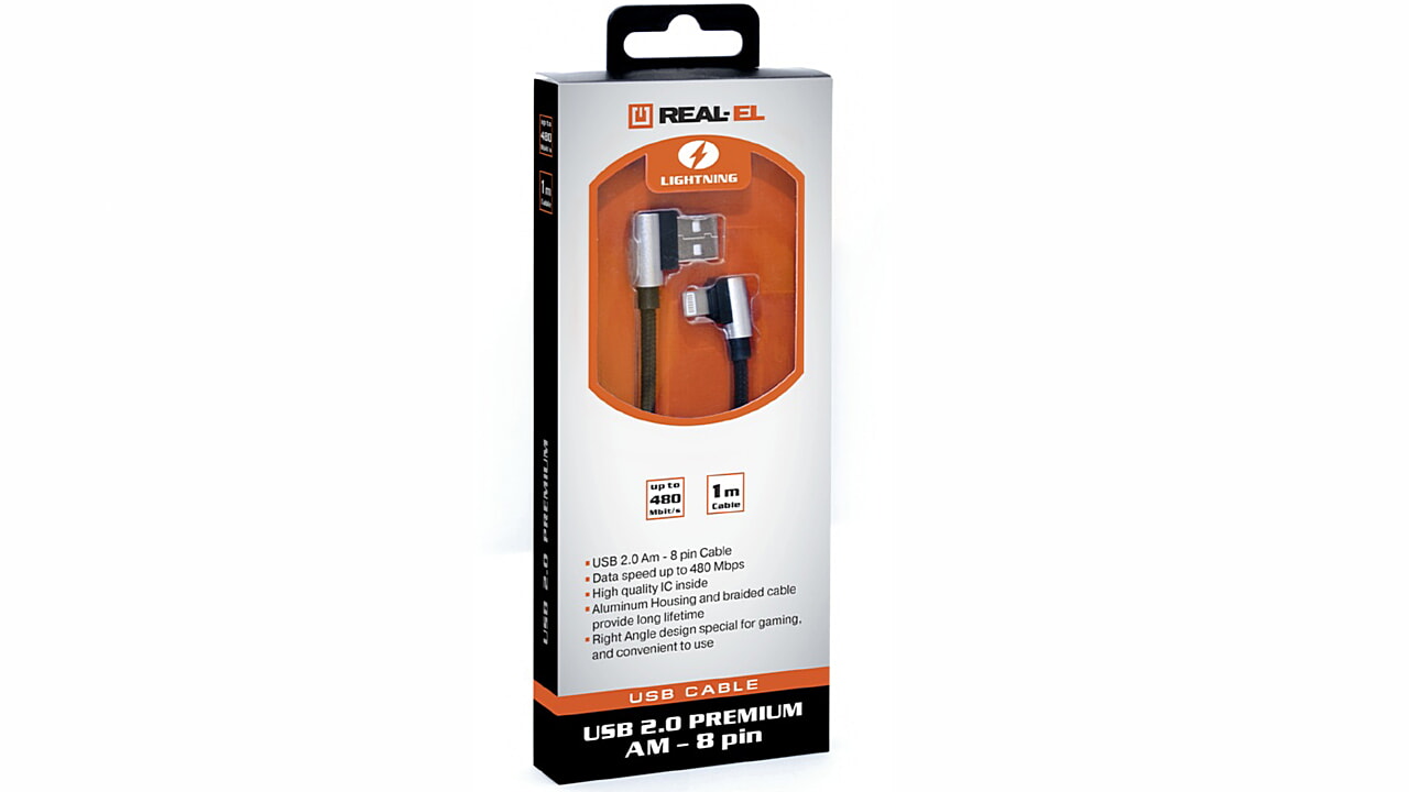 The REAL-EL USB 2.0 Premium AM - 8pin cable is used to connect devices using 8pin (Lightning Cable). The cable is highly practical for everyday use: the fabric braid prevents tangling, while the G-shaped connectors with cylindrical inserts are convenient for frequent device connections.