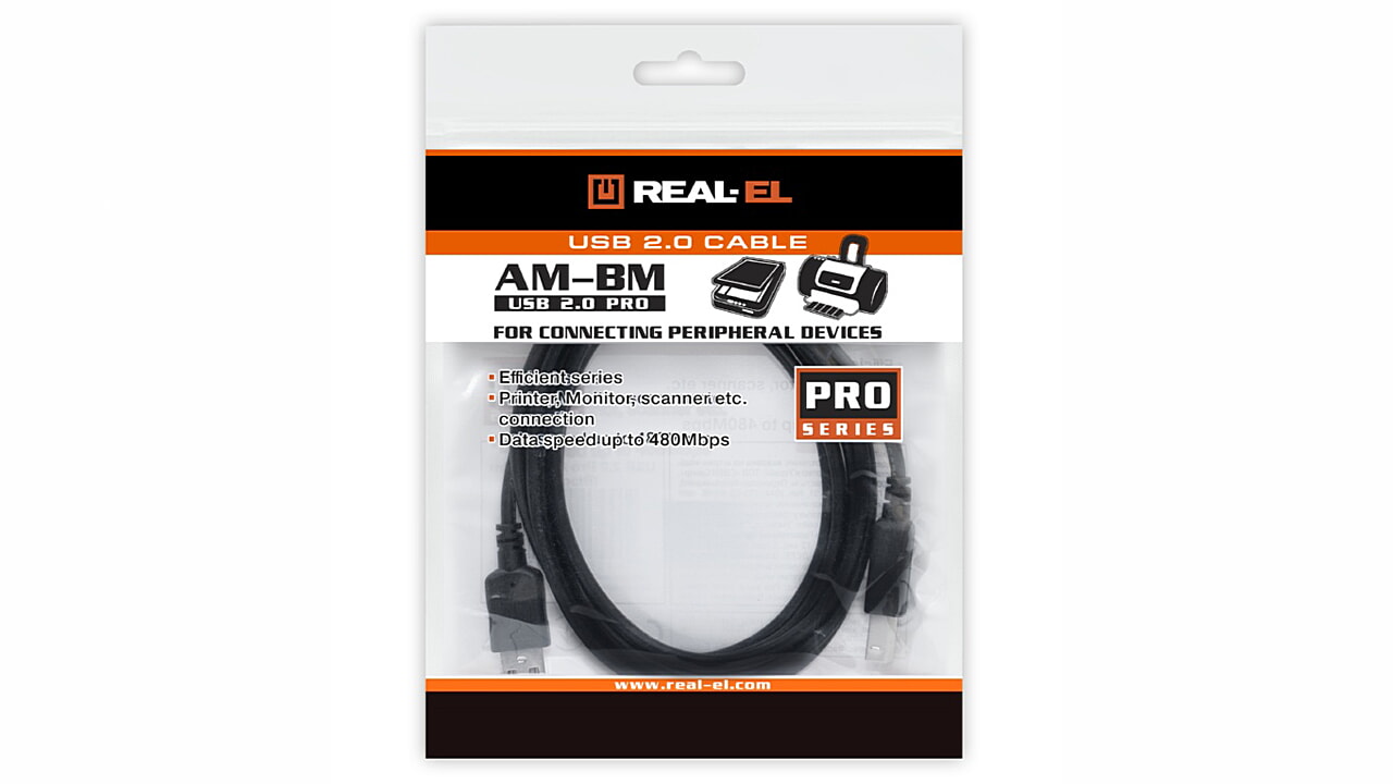 The REAL-EL USB 2.0 Pro Am-Bm cable is used to connect a computer to portable devices, hubs, printers, scanners, MFPs, etc.