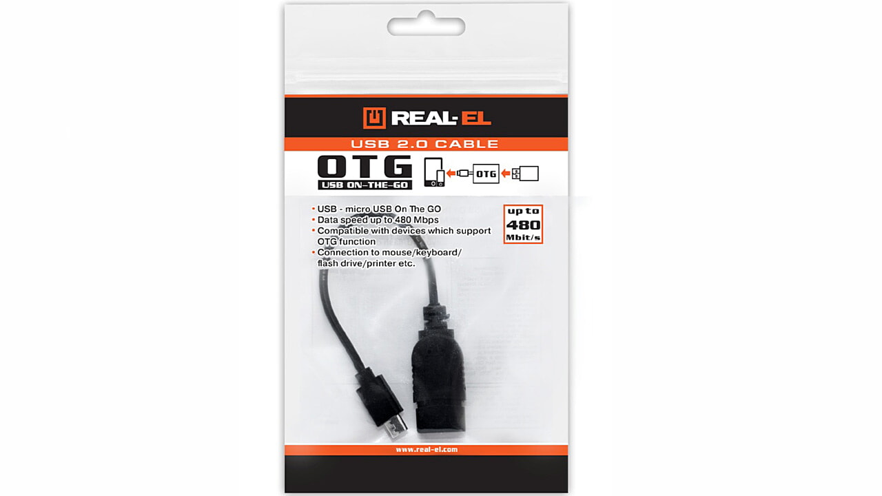 The REAL-EL USB OTG 0.1m cable (adapter) is designed to connect mobile devices to peripheral USB devices as a USB to micro USB adapter.