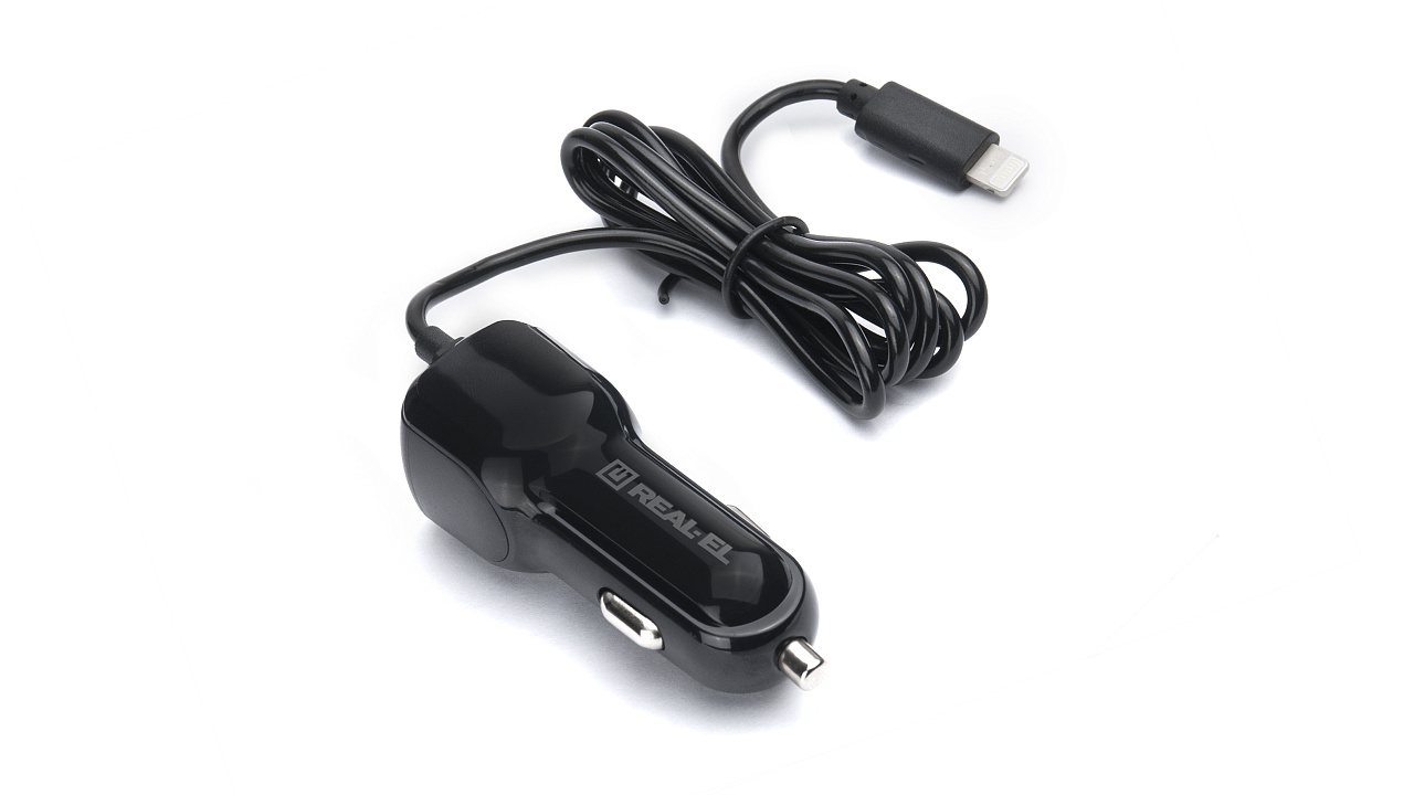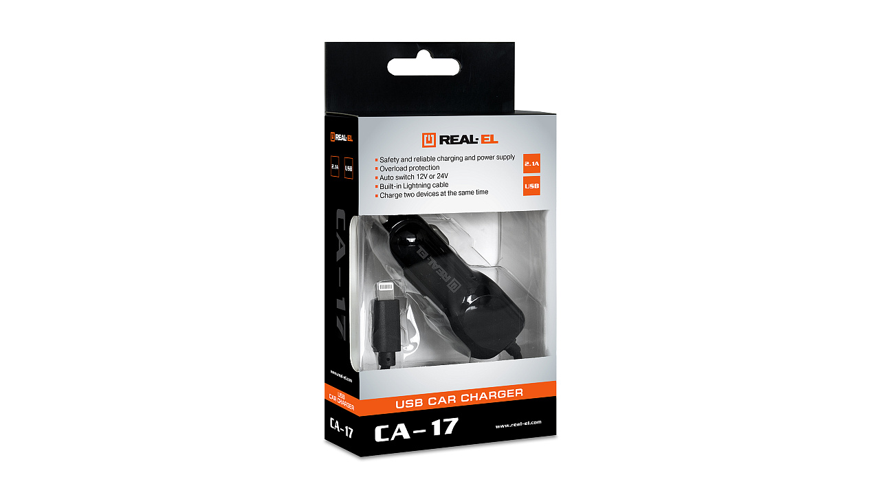 The REAL-EL CA-17 car USB charger with two outputs is designed to power and charge the batteries of portable devices (mobile phones, smartphones, GPS navigators, MP3 players, PDAs, tablet computers, and other digital devices) via the car's cigarette lighter socket.