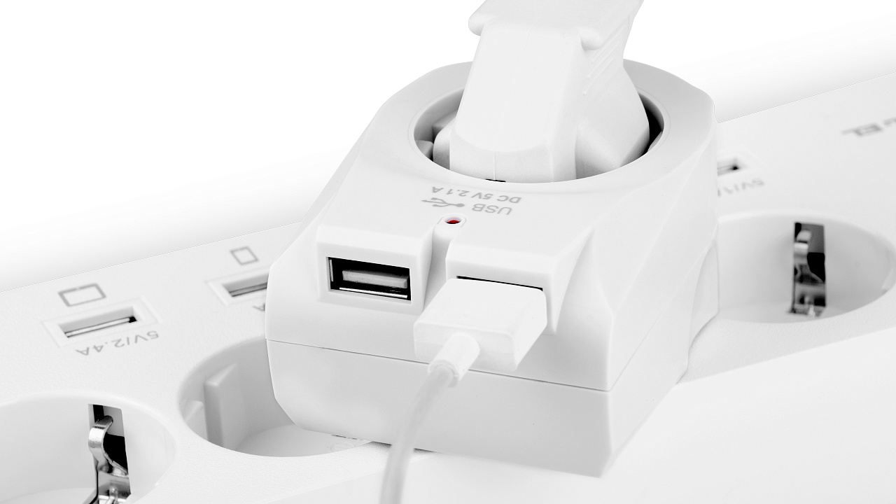 The USB network charger with a socket REAL-EL CS-25 is designed for charging batteries or powering portable devices from a household power network and simultaneous use as a power socket.