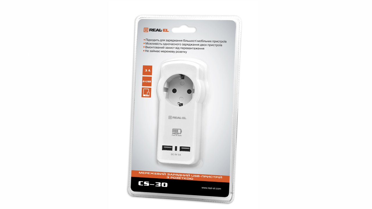 The network USB charging device with a socket REAL-EL CS-30 is designed for charging batteries or powering portable devices from a household electrical network and simultaneous use of it as a power socket.