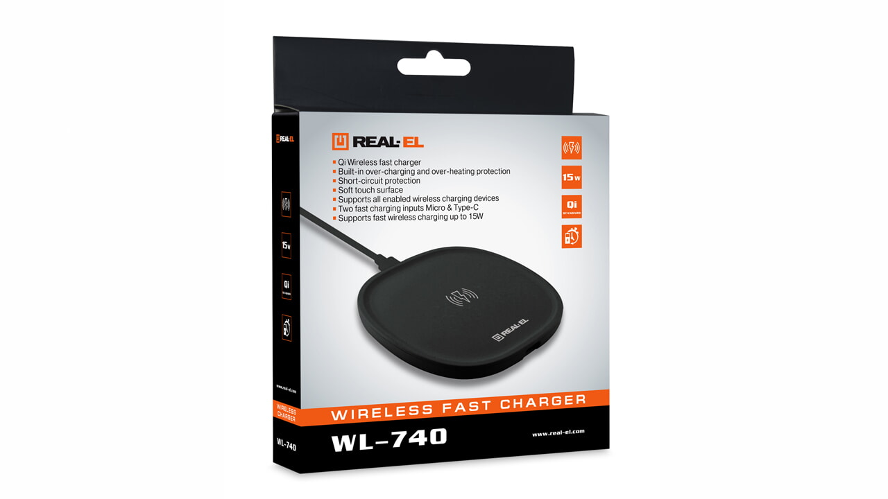 The REAL-EL WL-740 wireless charger is designed to power and recharge the batteries of devices that support wireless charging technology.