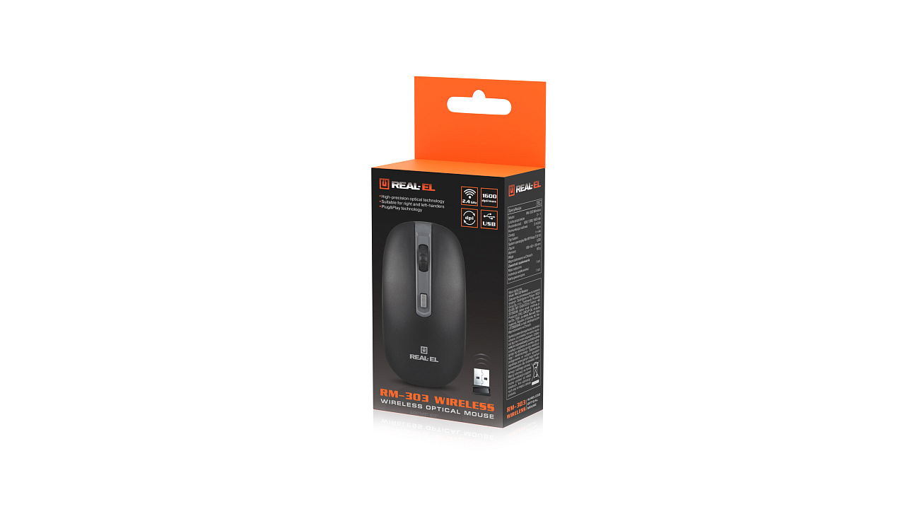 Energy-efficient wireless technology allows the REAL-EL RM-303 Wireless mouse to work on practically any surface. Features: 3 + 1 buttons, stylish ergonomic design, scroll wheel, resolution switch button, USB interface, extended battery life (up to 1 year).