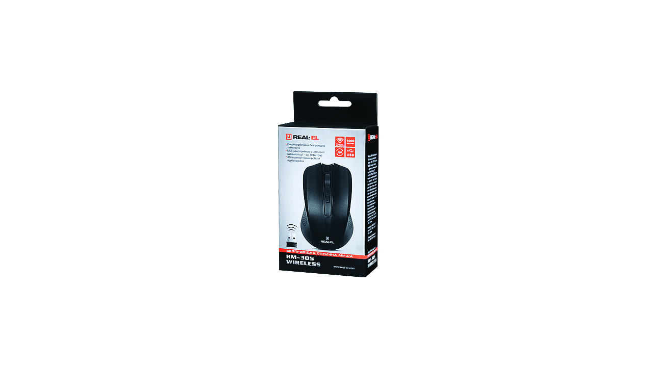Power efficient optical technology enables REAL-EL RM-305 Wireless optical mouse to operate practically on any surface. It has the following features: 3 + 1 (scroll wheel) buttons, 2.4 GHz USB nano receiver, high-speed response and high operation speed, 600/1000 dpi resolution, USB, convenient for operation with a notebook.