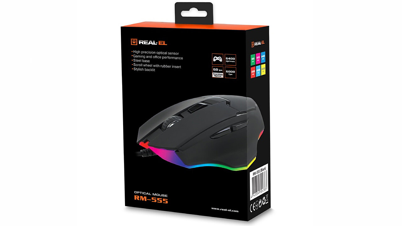 High-precision optical technology allows the gaming mouse REAL-EL RM-555 to work practically on any surface. Features: high operating speed, 5 + 1 buttons, scroll wheel, 2 navigation buttons "forward" and "backward", DPI resolution switch, built-in backlight.