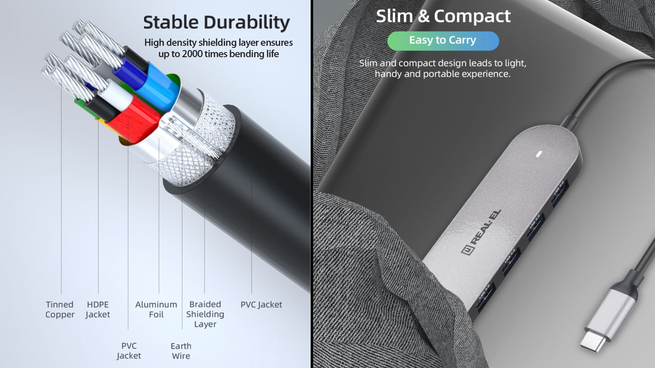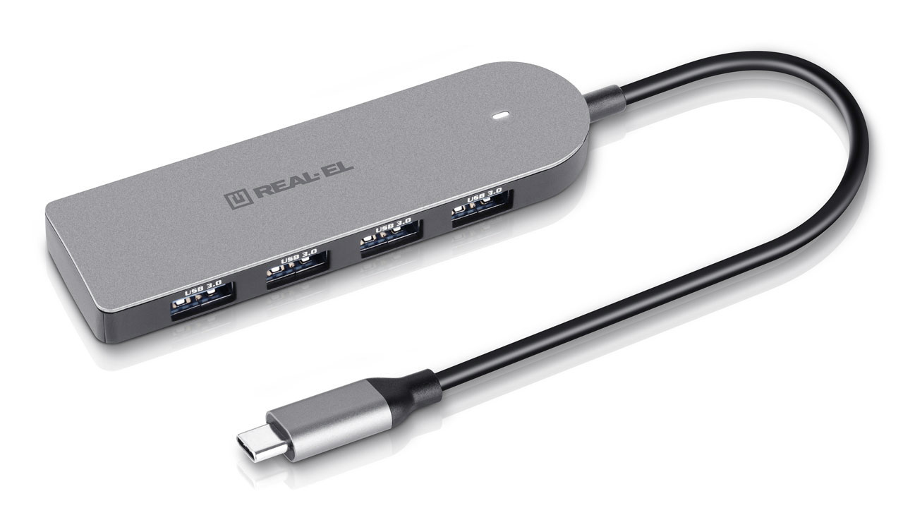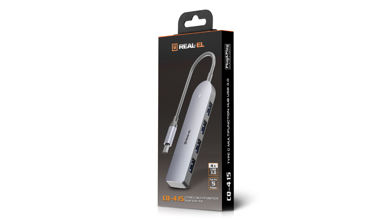 Type C multifunctional hub USB 3.0 REAL-EL CQ-415 is designed for use with all devices capable of connection via Type C port and supporting all necessary data transmission protocols.