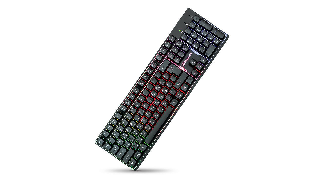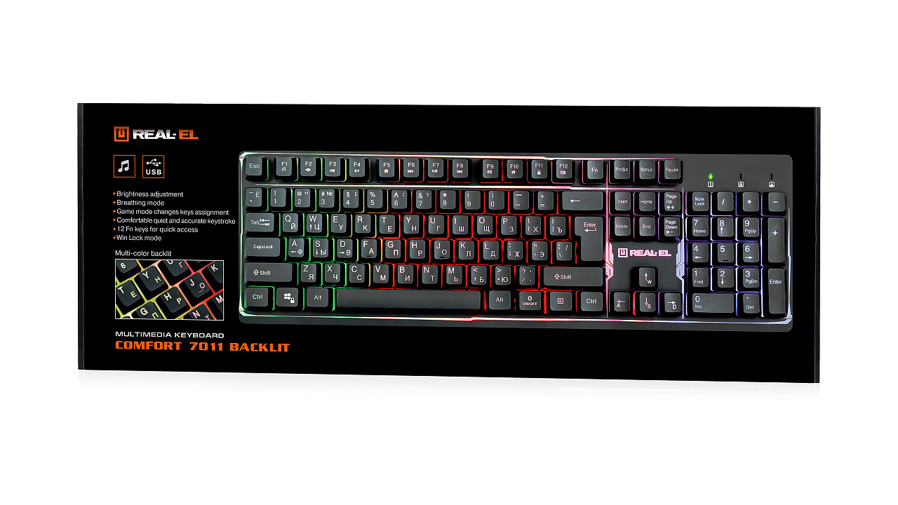 The feature of the REAL-EL Comfort 7011 Backlit multimedia keyboard is the multicolored backlighting with brightness level adjustment, Win Lock key lock function, which is convenient to use in games, comfortable quiet and precise key operation.