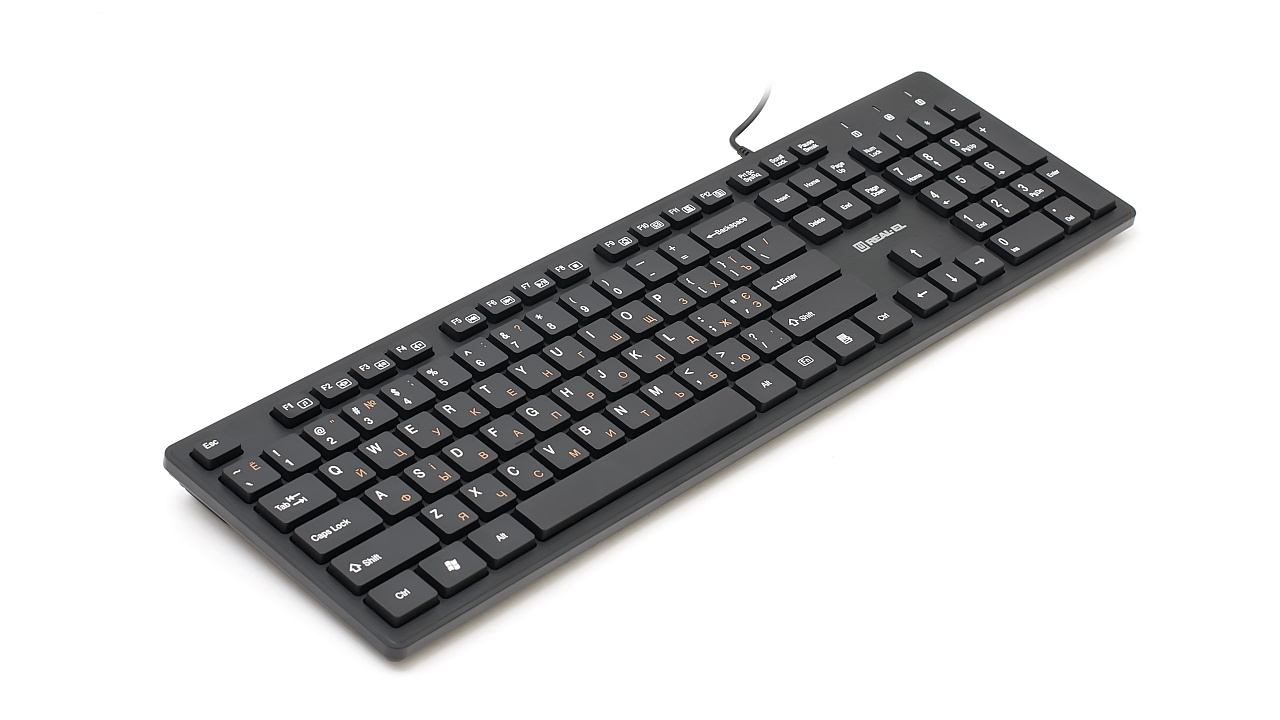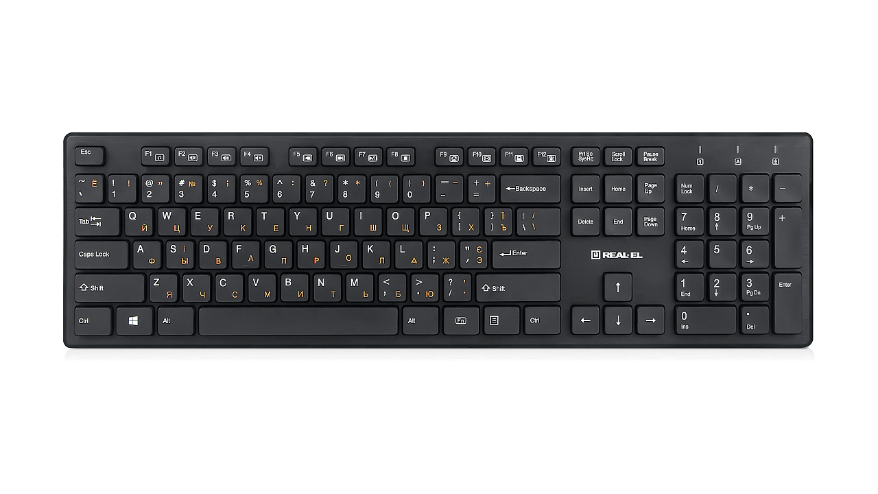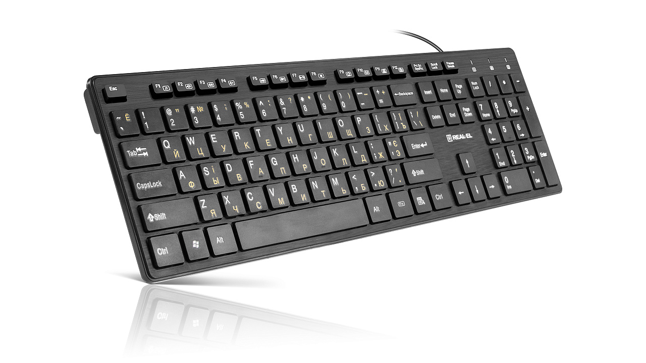 Modern slim compact design, traditional key layout, browser quick access key, USB interface, low-profile keys with soft touch - features of the REAL-EL Comfort 7080 keyboard.