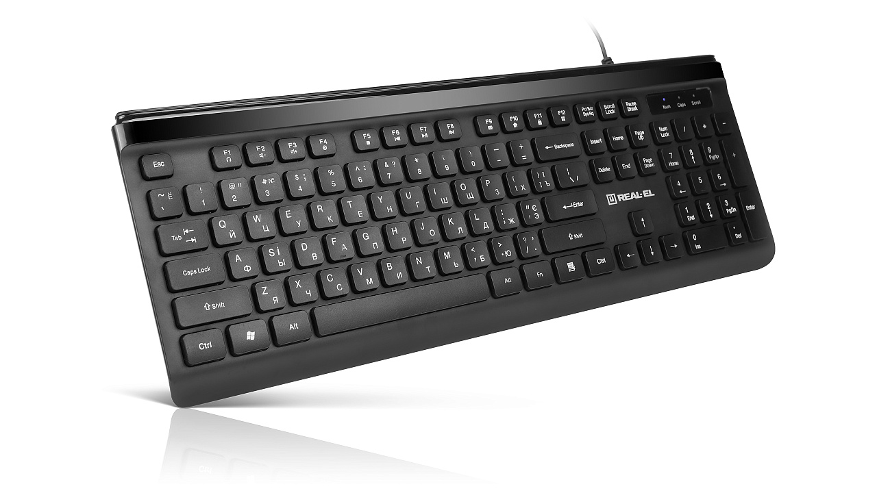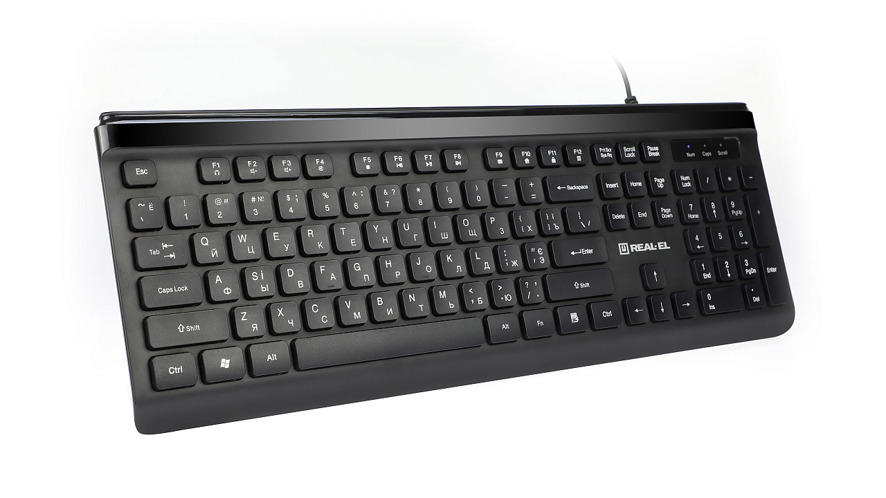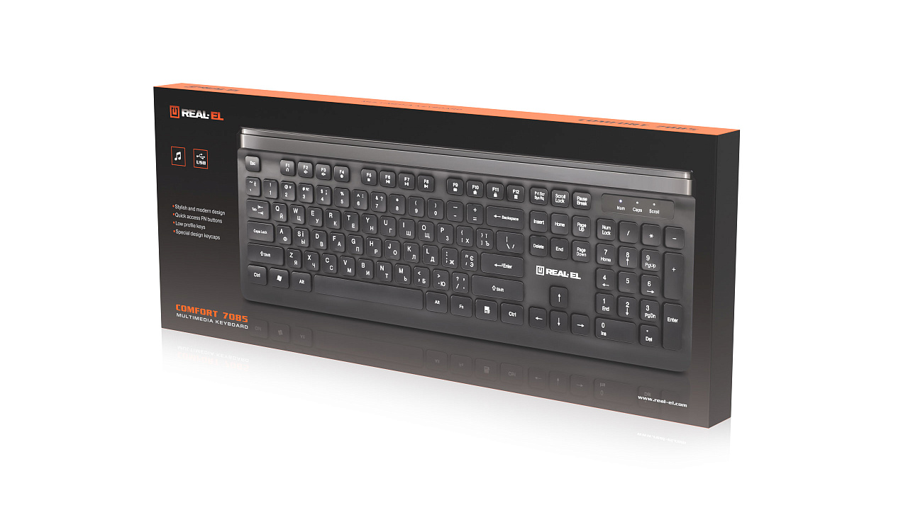 Modern thin compact design, special key design, traditional key layout, FN quick access buttons, USB interface, low-profile keys - features of the REAL-EL Comfort 7085 keyboard.