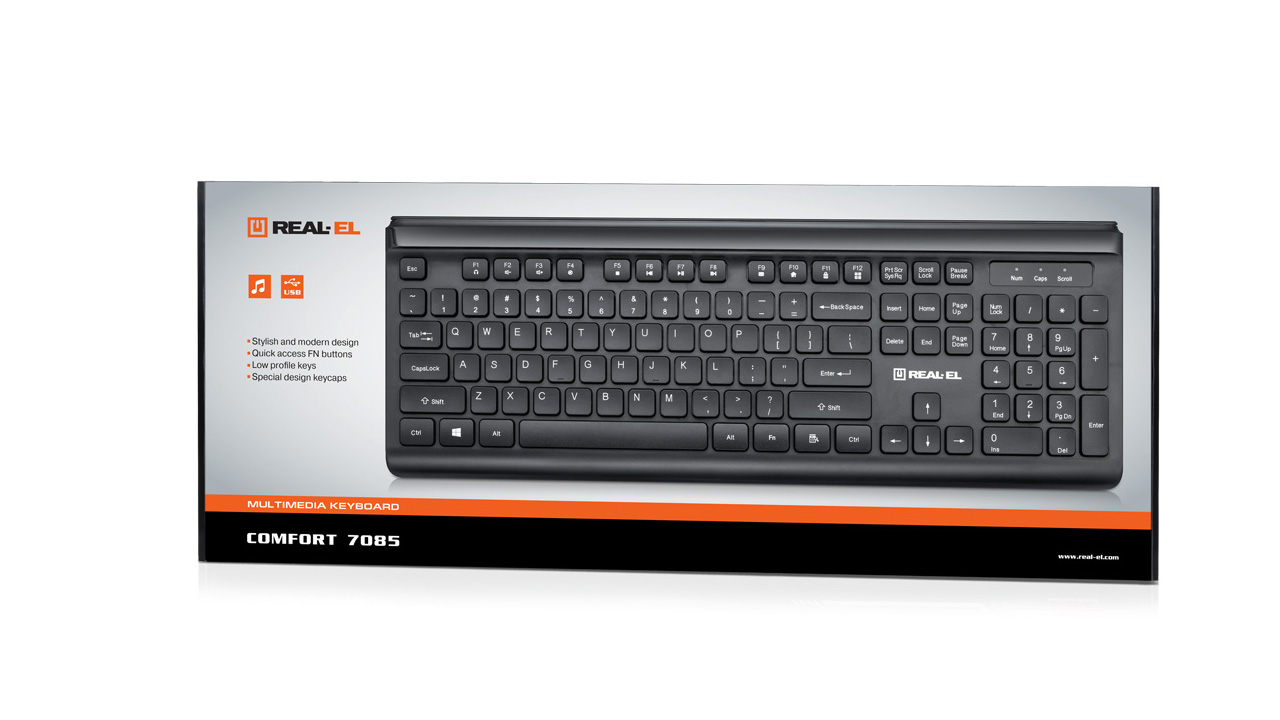 Stylish and modern design, Quick access FN buttons, Low profile keys, Special design keycaps are the features of the REAL-EL Comfort 7085 EN keyboard.