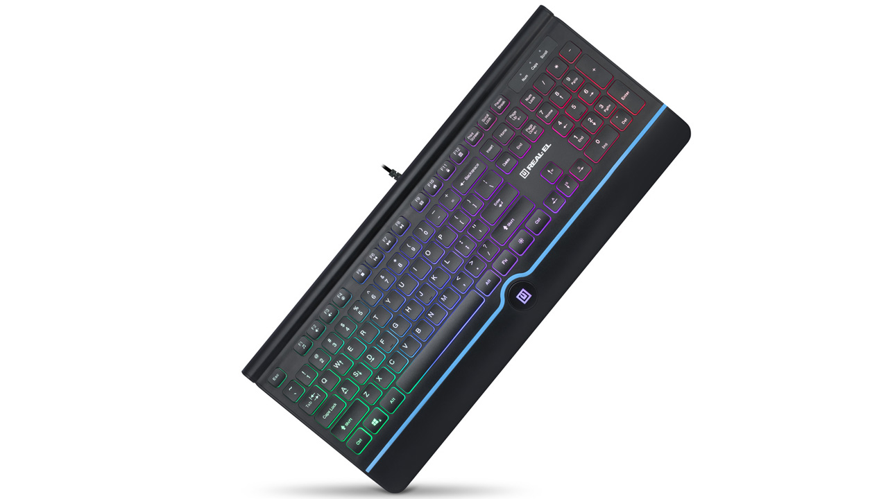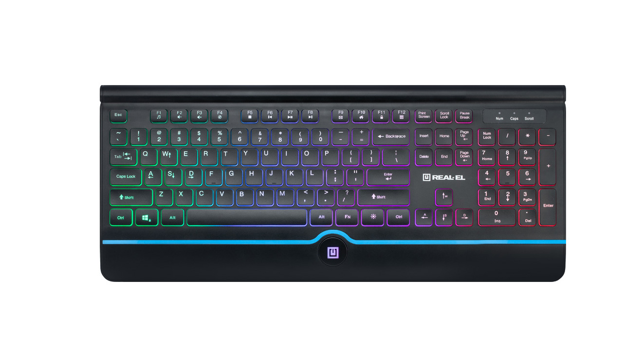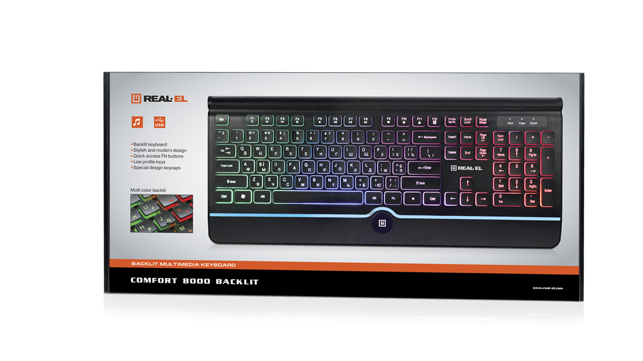 The REAL-EL Comfort 8000 EN multimedia keyboard has the following features: stylish and modern design, RGB backlit for symbols and edges of keys, 12 Fn shortcut buttons to Windows, low profile keys special design keycaps .