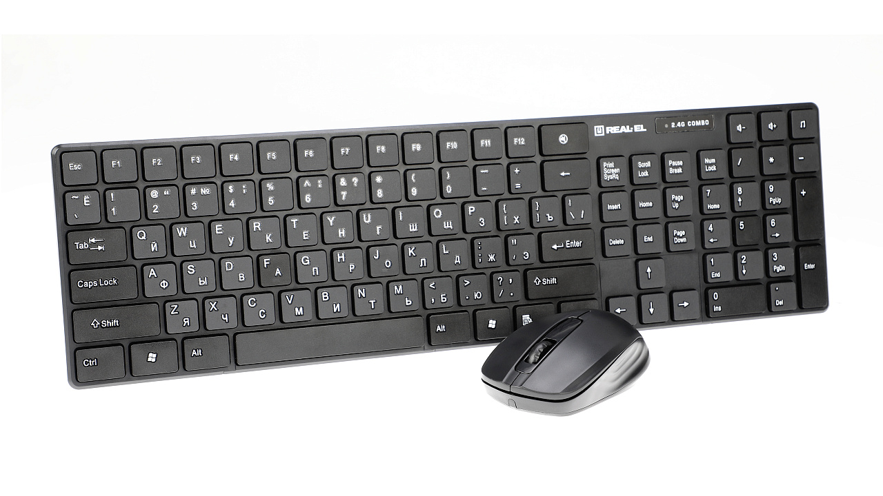 Compact design, saving your space, quick access to volume control buttons, working distance up to 10 m, automatic connection of the mouse to the keyboard - features of the wireless set standard keyboard + mouse REAL-EL Comfort 9010 Kit Wireless.