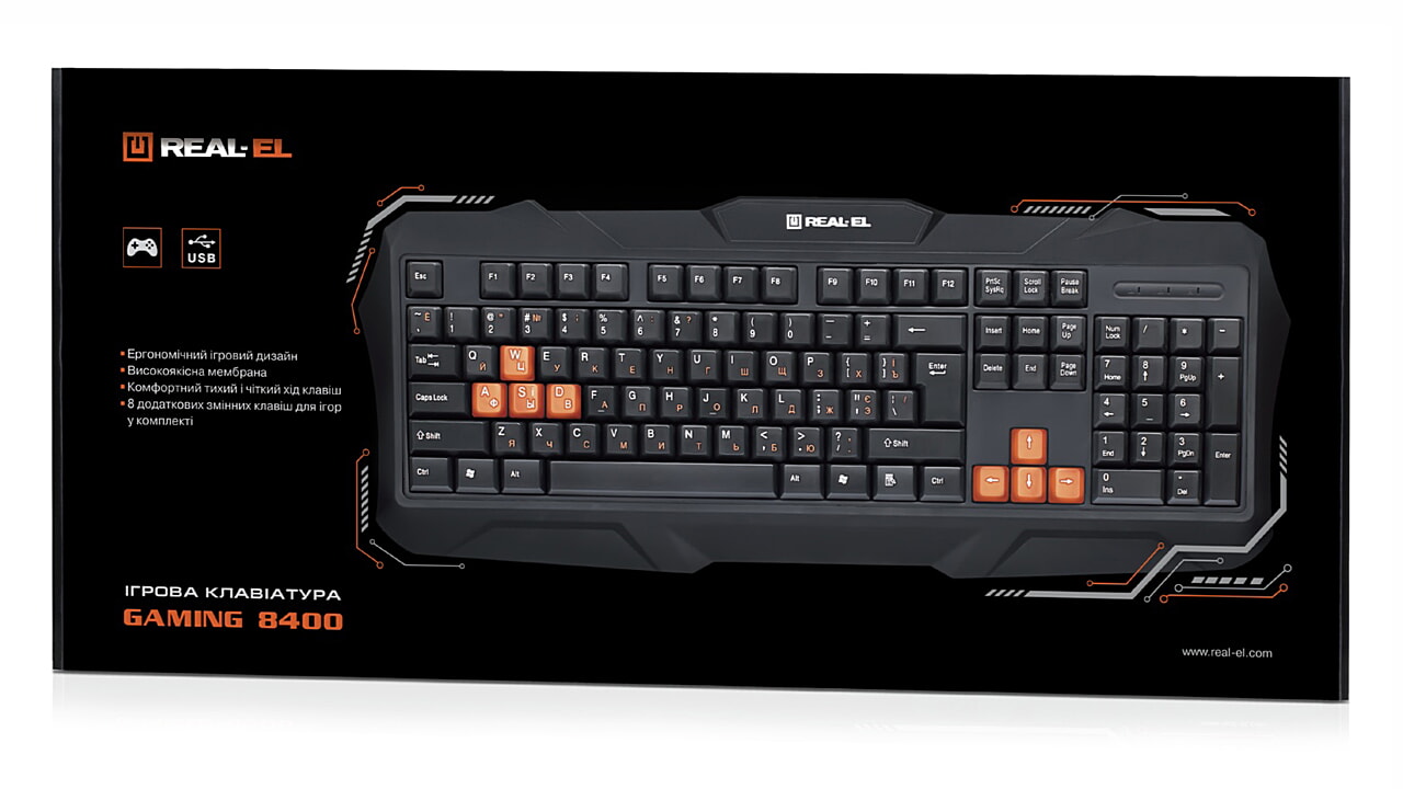 The REAL-EL Gaming 8400 gaming keyboard has the following features: ergonomic gaming design, 8 replacement keycaps for gaming included, high-quality membrane, comfortable, silent and soft keystroke.