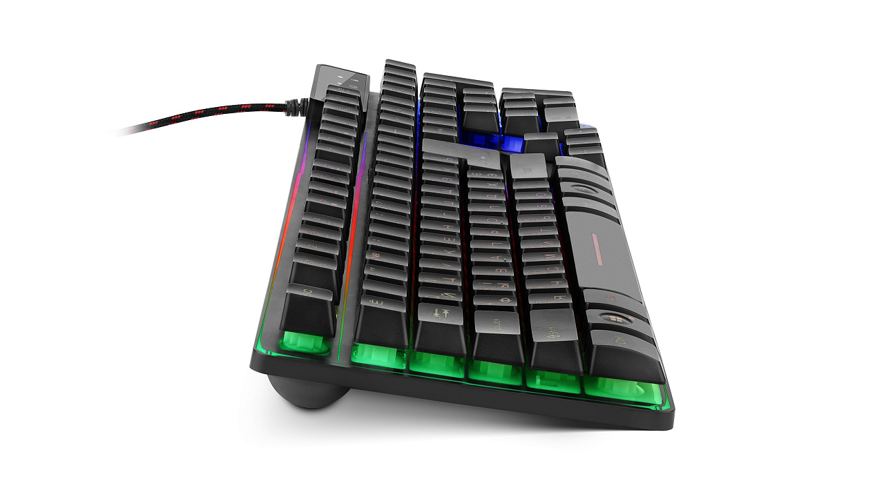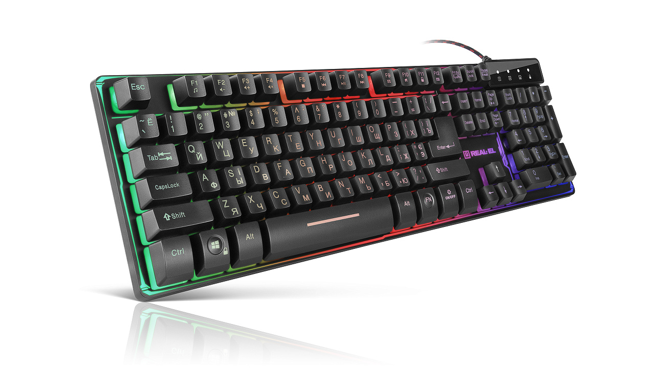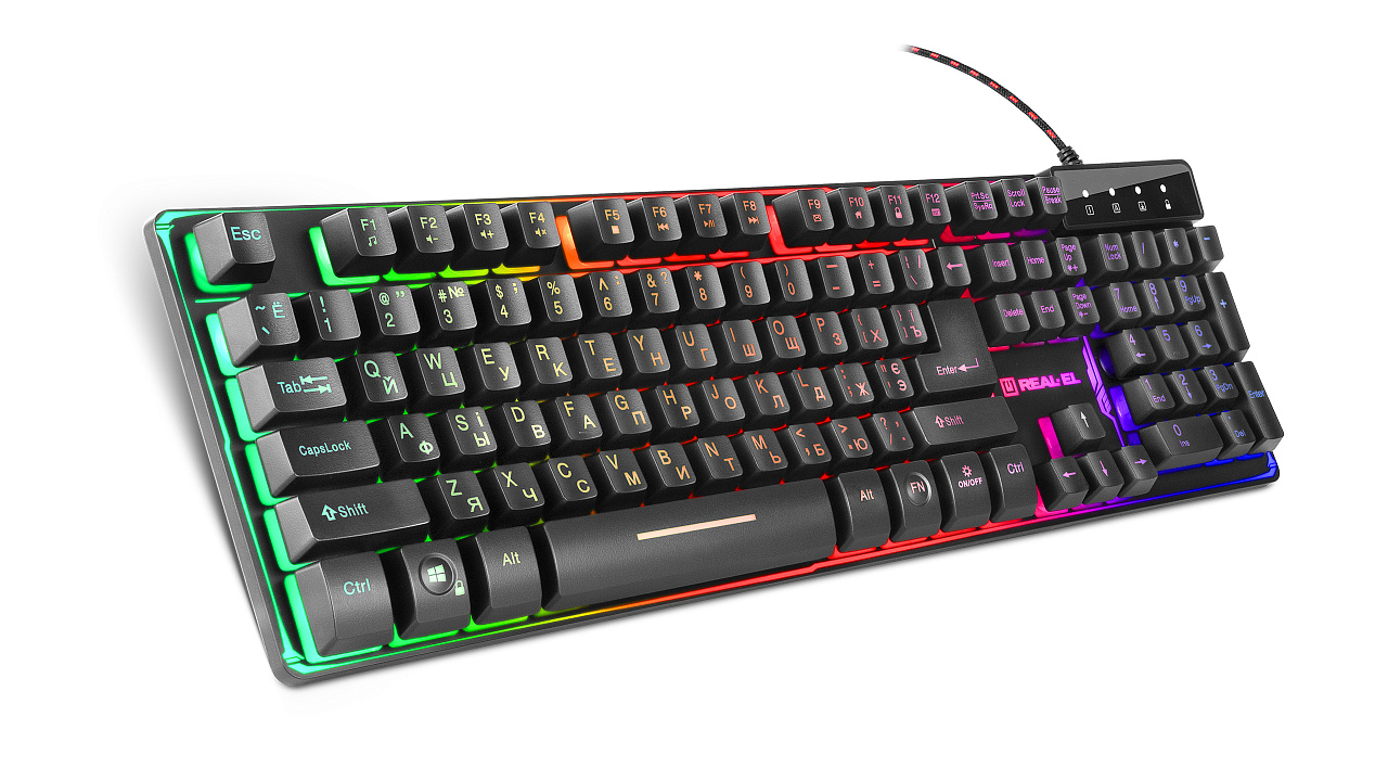The feature of the REAL-EL GAMING 8700 Backlit gaming keyboard is: ergonomic gaming design, metal base, reduced noise during operation, quiet and precise key strokes, 12 Fn quick access buttons to Windows, Internet, and Multimedia, cable in fabric braid. Multicolor backlighting with various brightness modes, "breathing" mode is available.