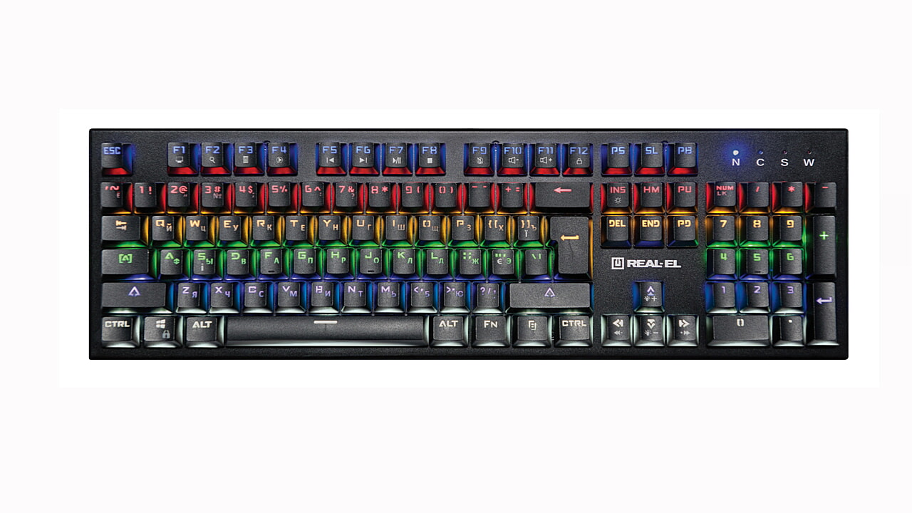 Metal base, NKRO, full backlit with extra light effects, reliable mechanical switches, quick access to multimedia, are the features of the GAMING MECHANICAL KEYBOARD REAL-EL M14 Backlit .