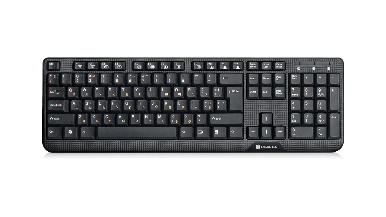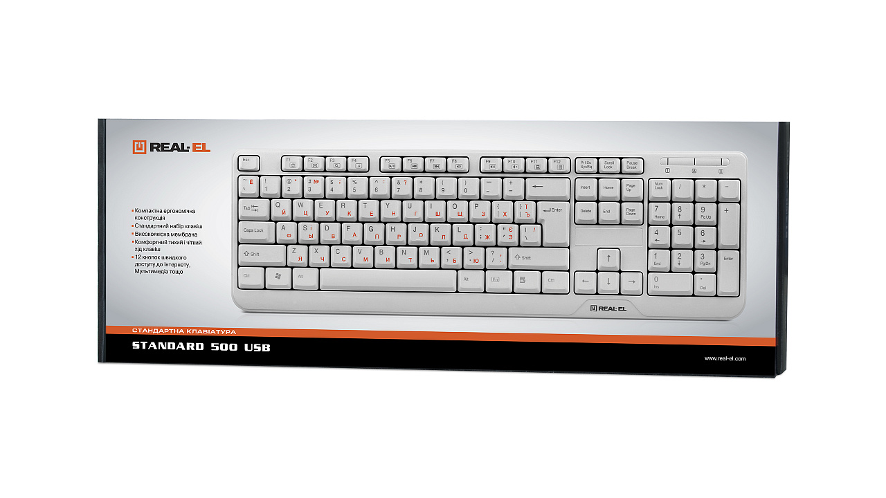 The REAL-EL Standard 500 keyboard is equipped with a USB or PS/2 interface. Its installation is done automatically after connecting to a USB or PS/2 port on the PC. High-quality membrane and quiet key operation ensure easy and soft button presses. For convenience, the model is equipped with a shortcut key to the calculator.