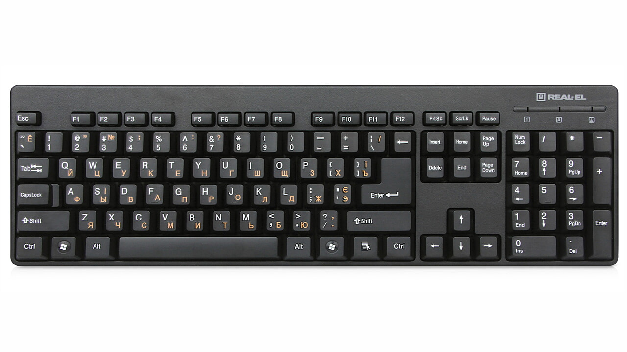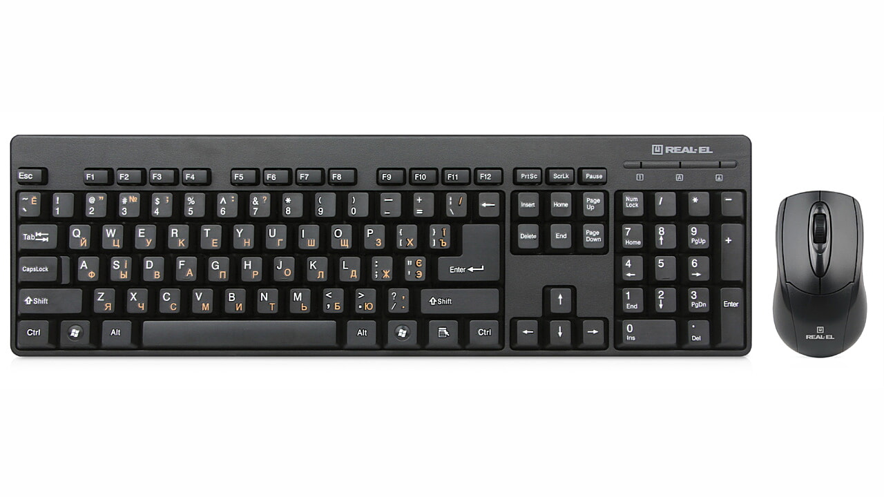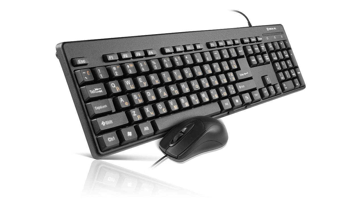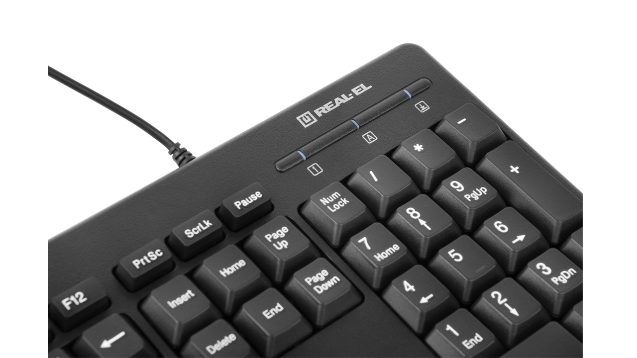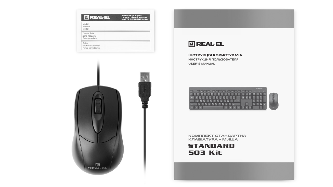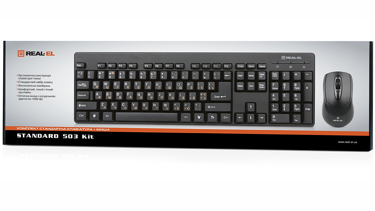 Ergonomic design, standard key layout, high-quality membrane, comfortable, quiet, and precise key operation, USB interface - features of the REAL-EL Standard 503 Kit keyboard + mouse set.
