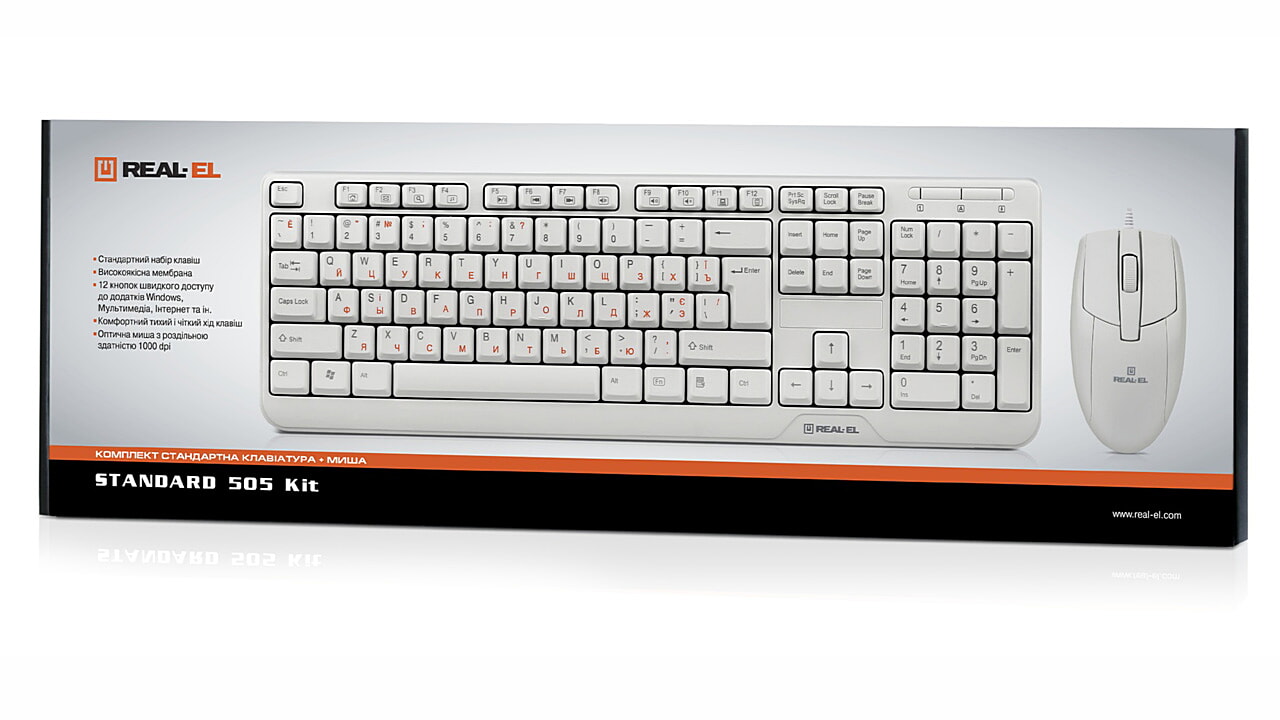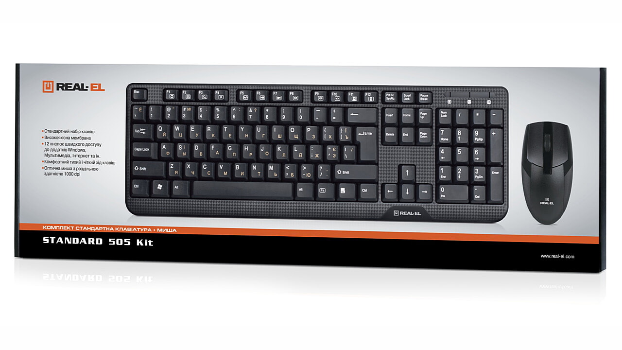 Ergonomic design, standard set of keys, USB interface, 12 shortcut keys, optical mouse has 1000 dpi resolution, high-quality membrane, low operation noise are the features of the REAL-EL Standard 505 Kit multimedia keyboard + mouse kit.