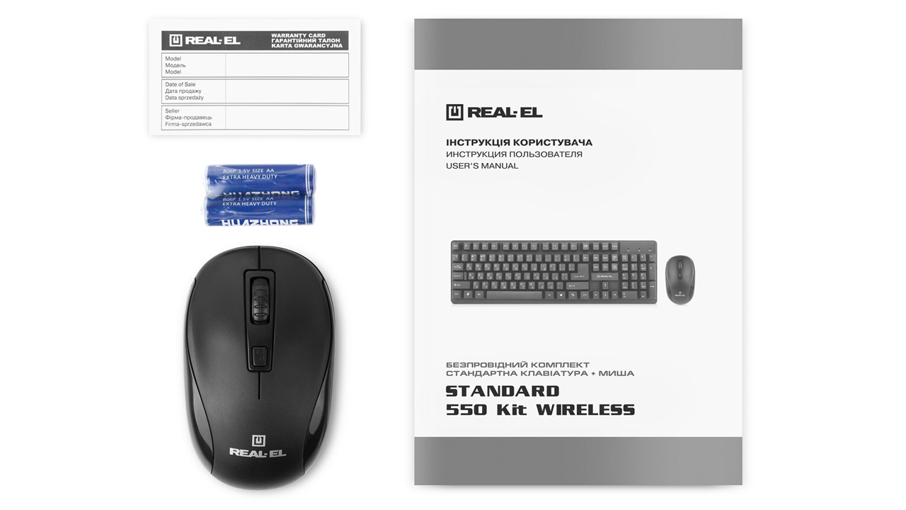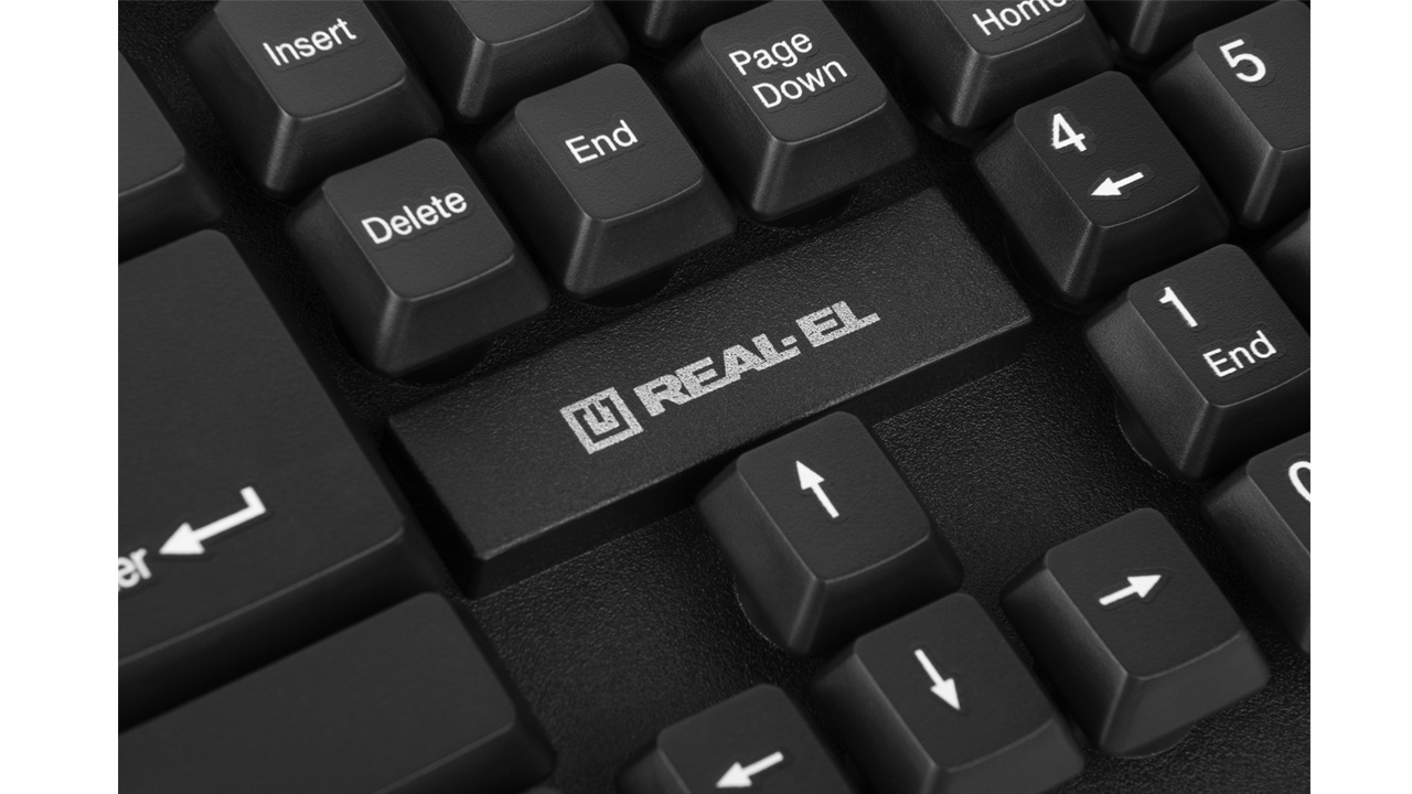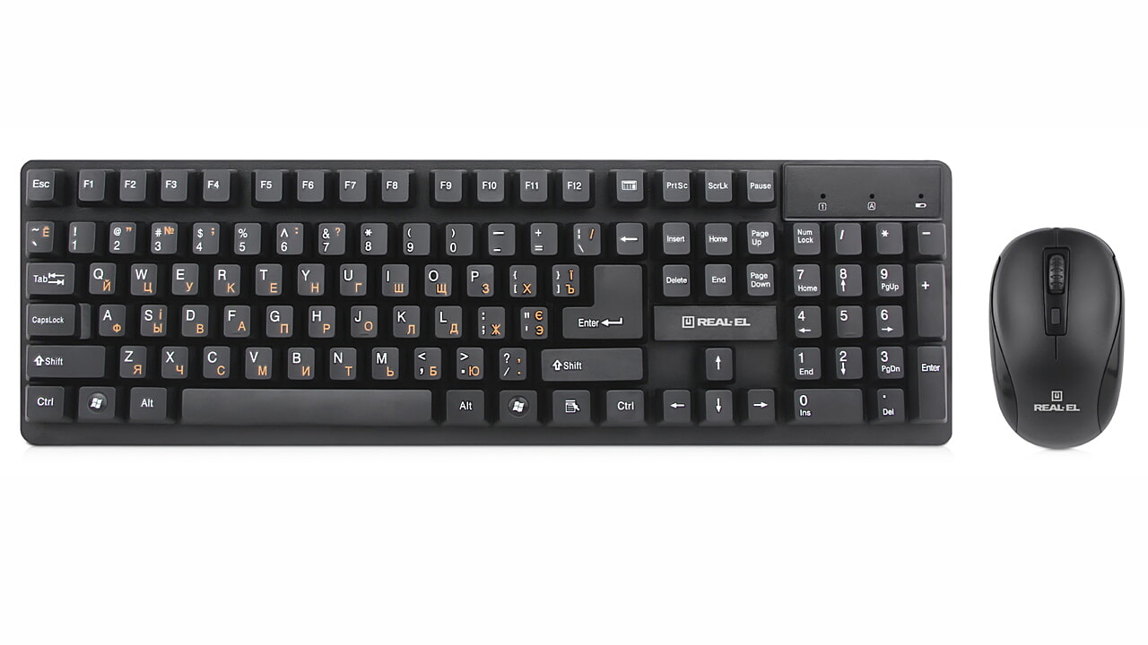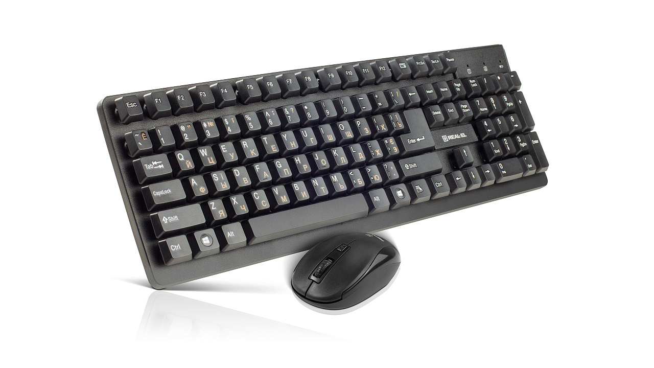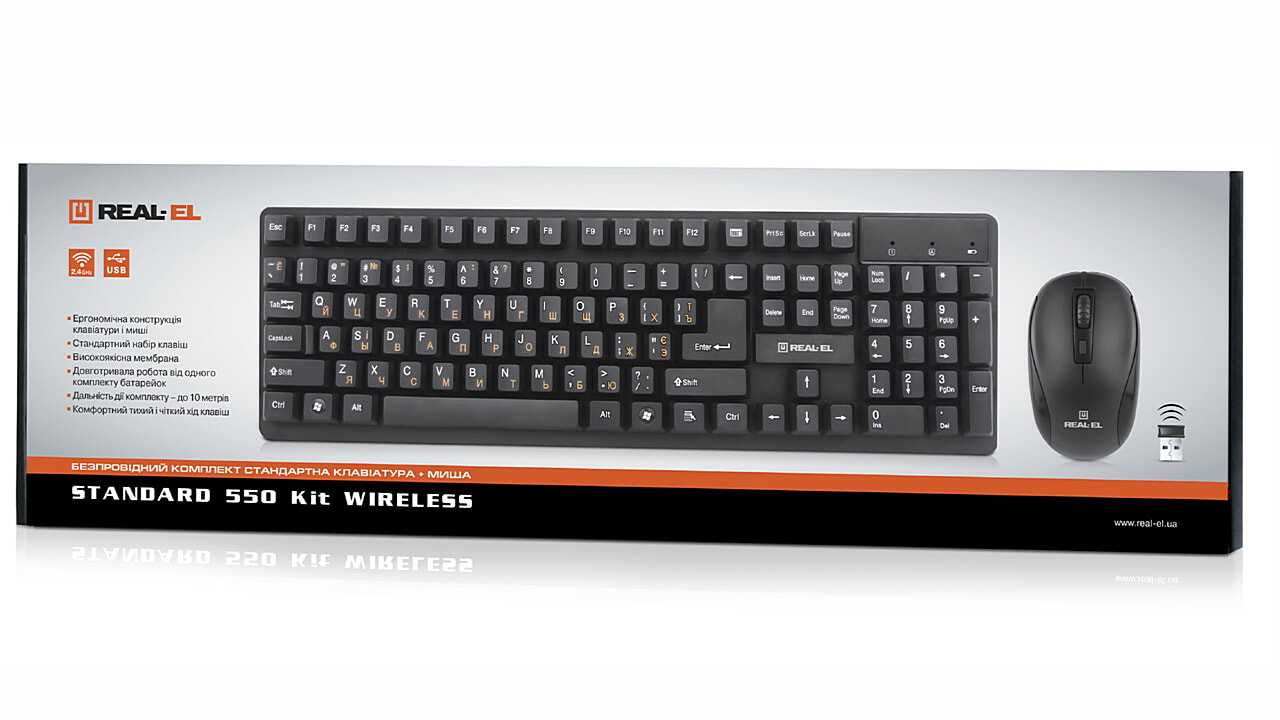 Ergonomic design of the keyboard and mouse, standard key layout, USB, automatic connection, no need for receiver pairing with the manipulator, up to 10 m distance, reduced noise during operation, long battery life from a single set of batteries - features of the wireless kit standard keyboard + mouse REAL-EL Standard 550 Kit Wireless.