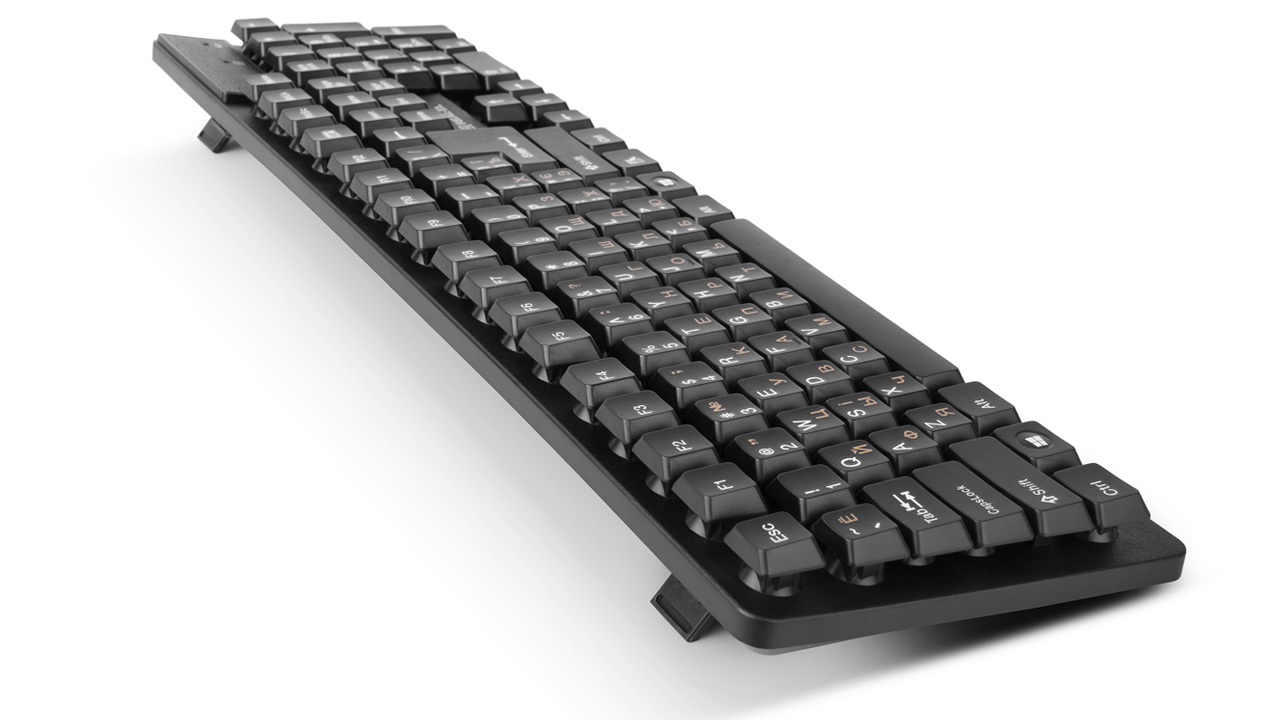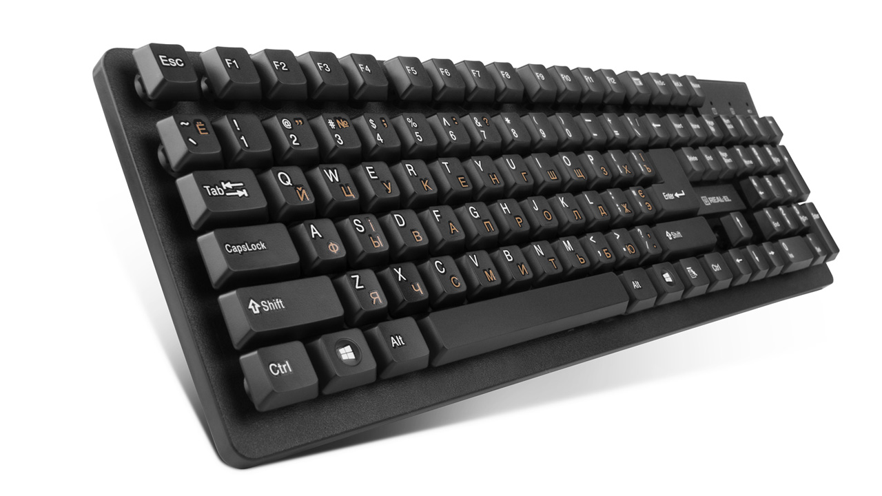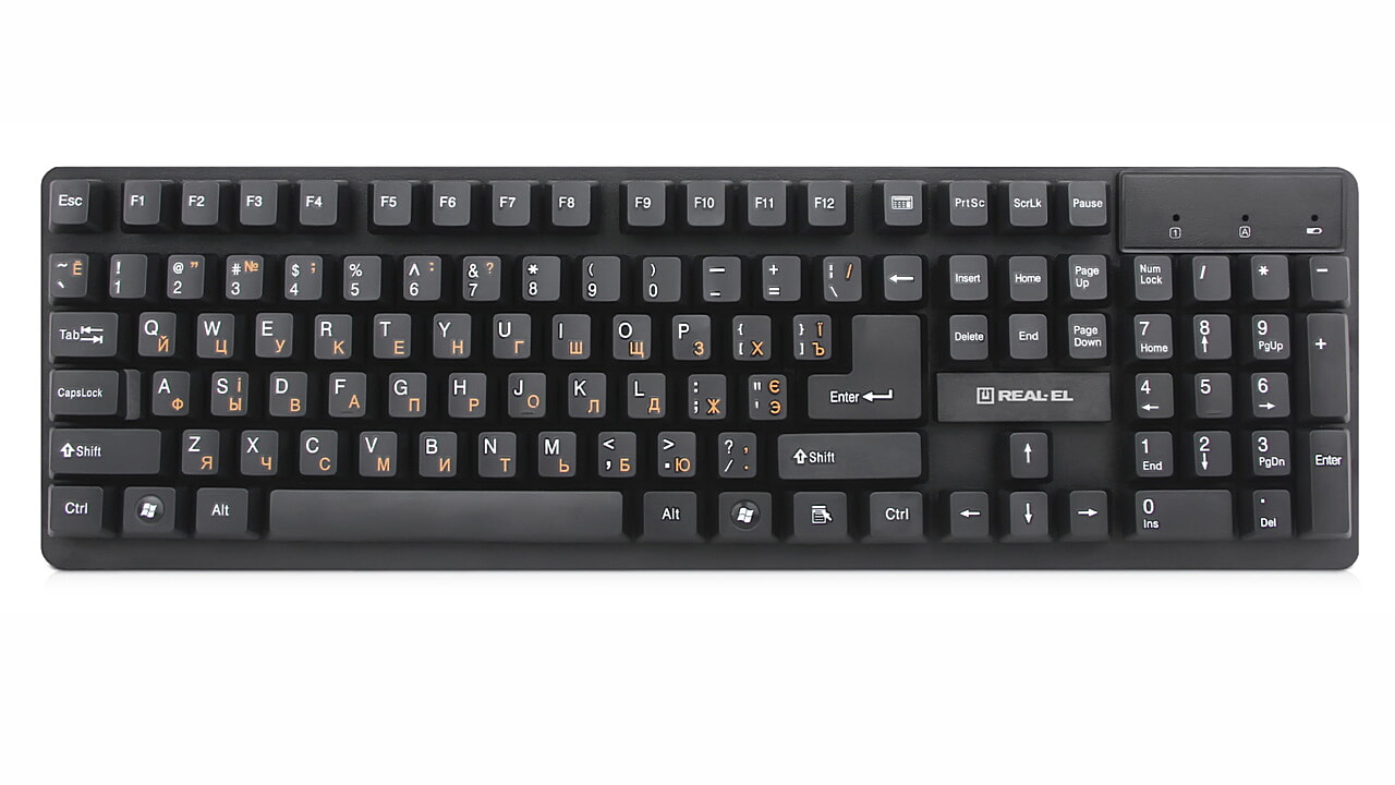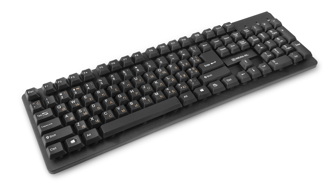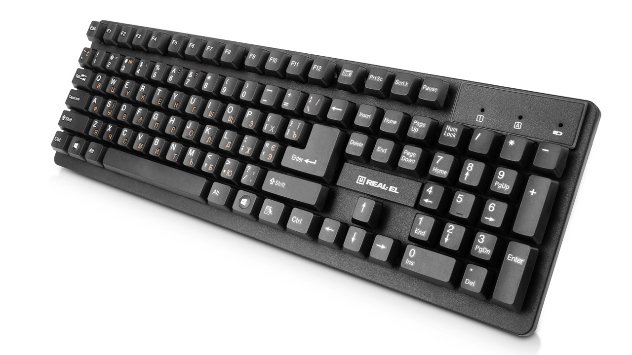 Ergonomic design of the keyboard and mouse, standard key layout, USB, automatic connection, no need for receiver pairing with the manipulator, up to 10 m distance, reduced noise during operation, long battery life from a single set of batteries - features of the wireless kit standard keyboard + mouse REAL-EL Standard 550 Kit Wireless.