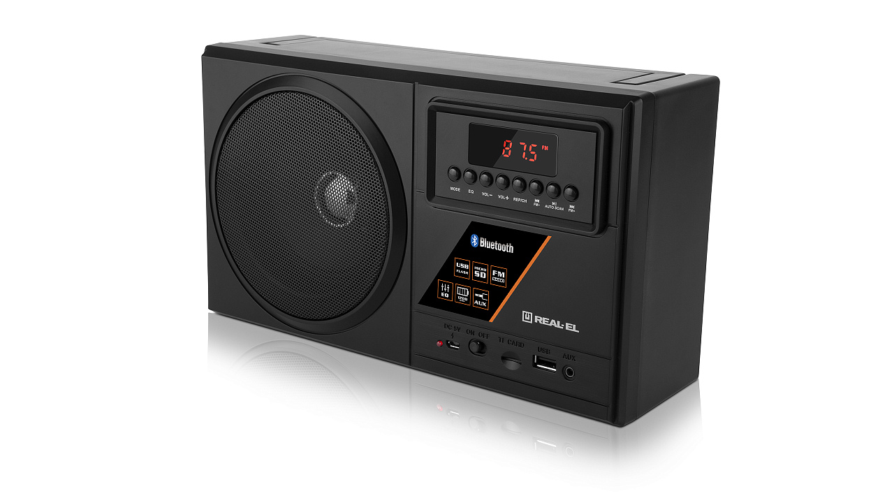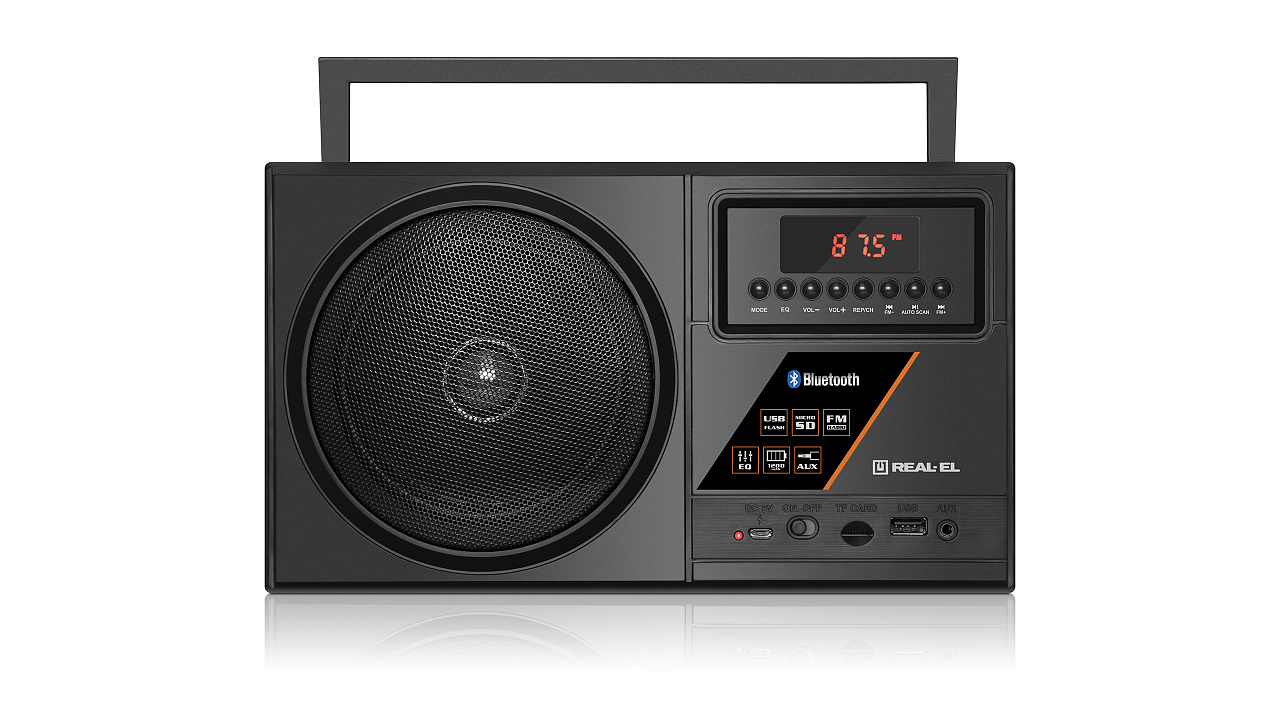 The portable radio receiver REAL-EL X-700 is an excellent companion for trips, travels, and walks, as well as a wonderful companion at home and work. In addition to being able to take your favorite FM radio stations anywhere, the receiver model includes a multitude of modern options: wireless signal transmission via Bluetooth, playback from USB flash and microSD card media, AUX input.