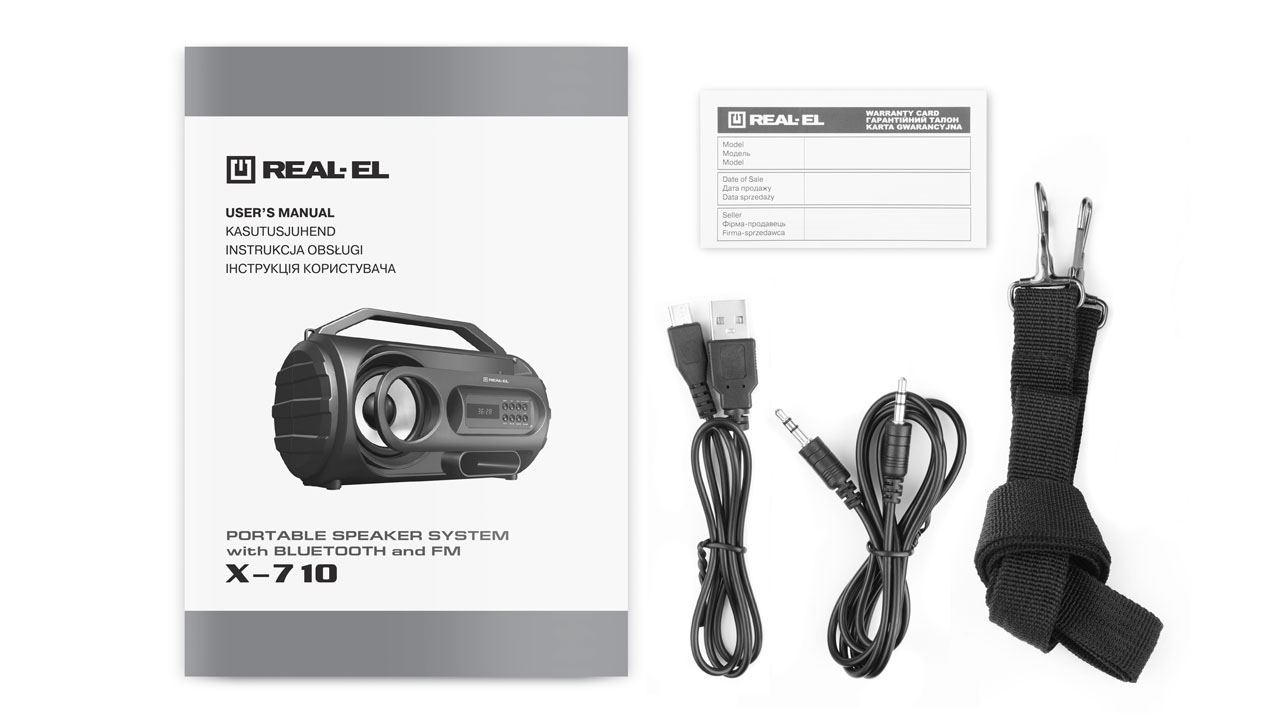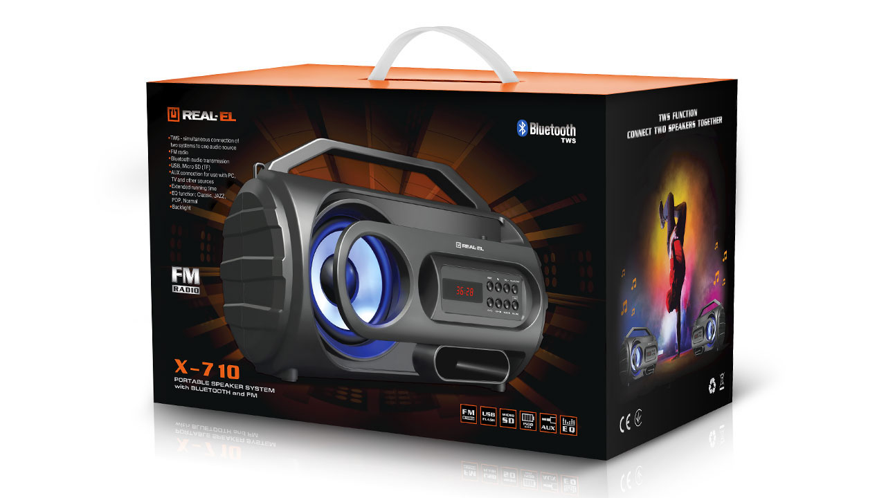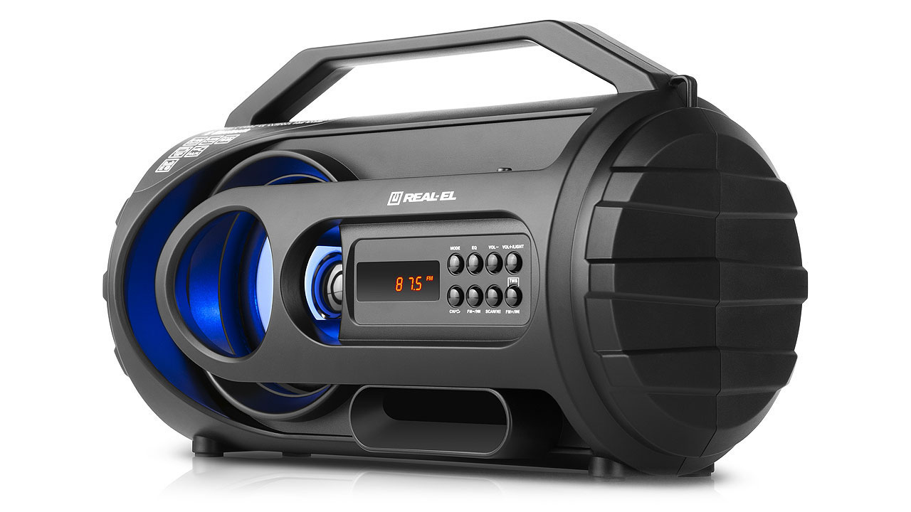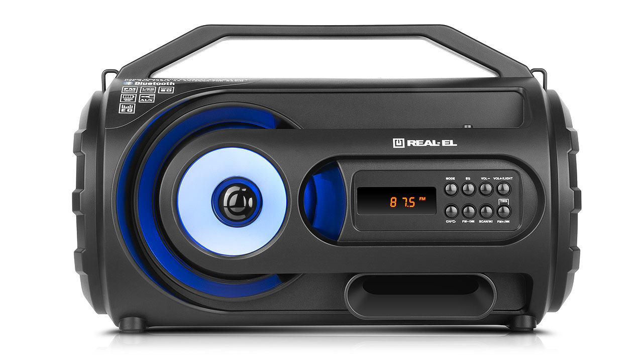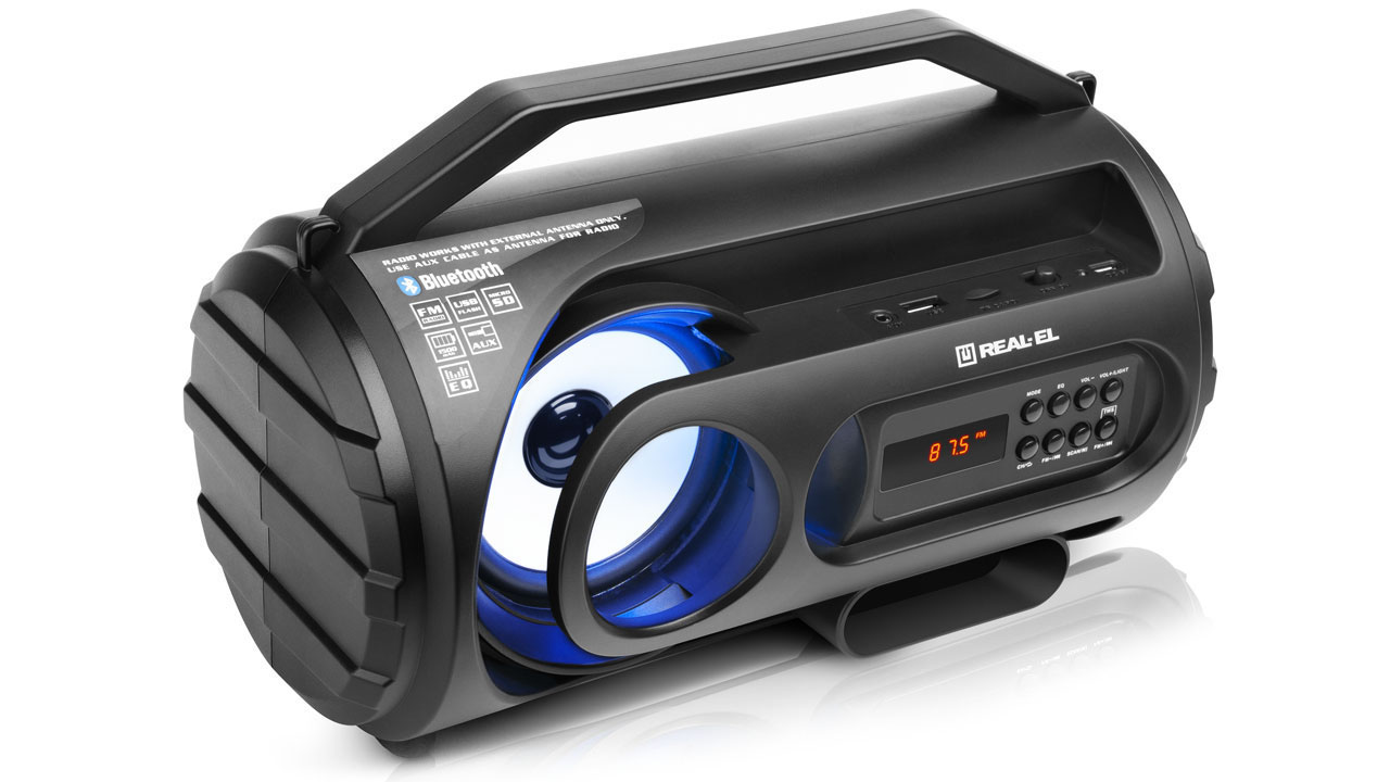 The multimedia portable acoustic system REAL-EL X-710 features a modern design with lighting and high-quality sound. The wide functionality of the "boombox" allows listening to music by connecting a mobile device, PC, TV, laptops, etc., both through the AUX output and via Bluetooth. USB and Micro SD card slots provide the ability to listen to audio files from flash drives. X-710 is an excellent companion for outdoor leisure, and the 1500 mAh lithium-ion battery will supply you with music for a very long time.