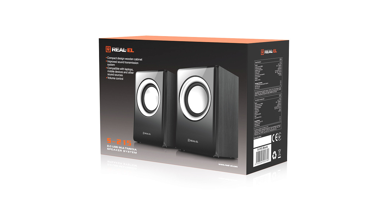 REAL-EL S-215 multimedia USB acoustic system is an easy and accessible solution for soundtracking your computer (laptop). The acoustic system is compatible with mobile devices and other sound sources.