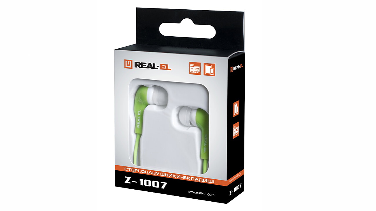 REAL-EL Z-1007 earphones are designed for operation with PC sound cards and other compatible systems (portable record players, computer game consoles, etc.).