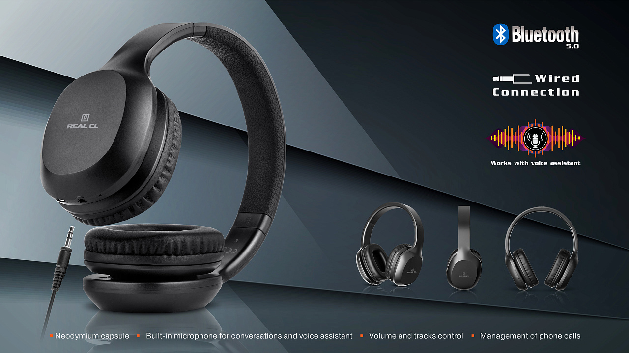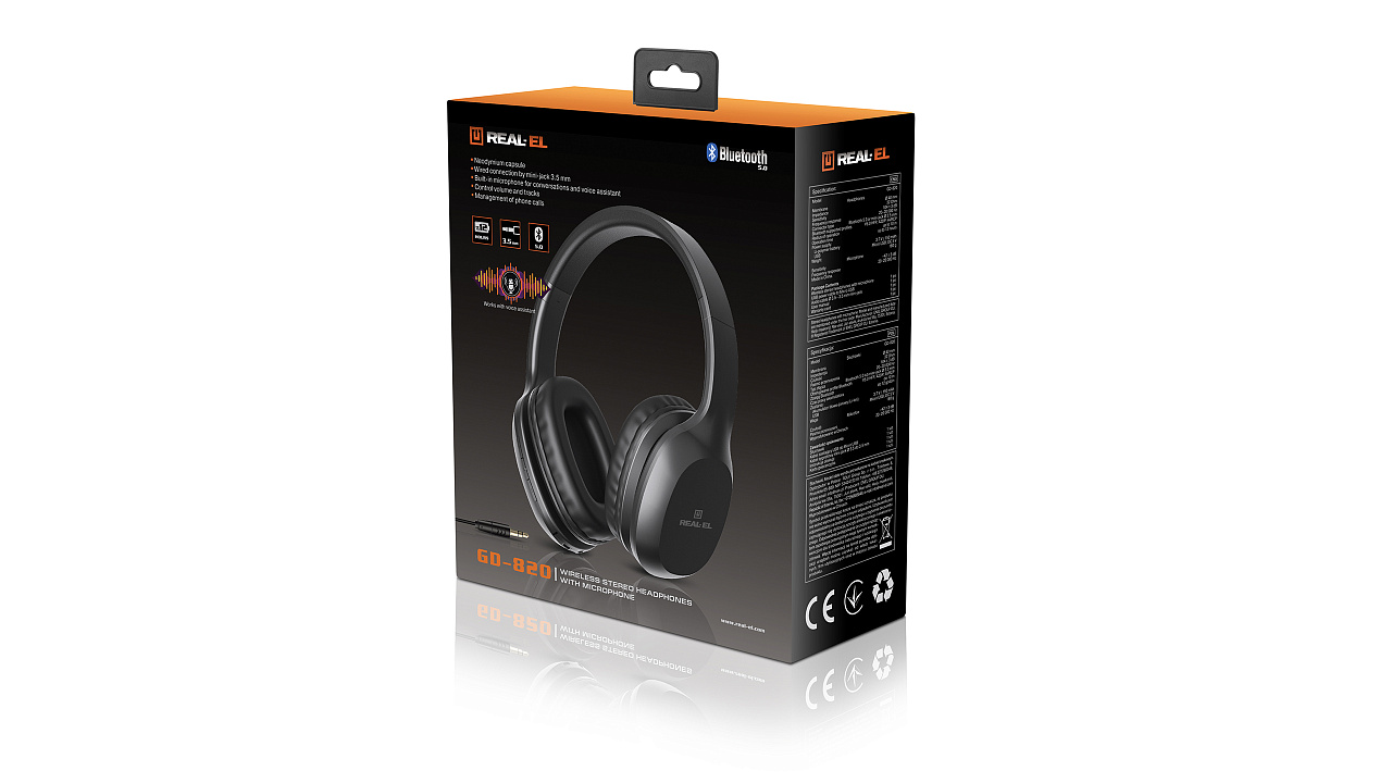 The REAL-EL GD-820 wireless headphones with a microphone reproduce high-quality clear sound, perfect for listening to music, watching videos, communicating, and gaming. The headset is lightweight and compact, made of durable plastic that does not retain fingerprints.