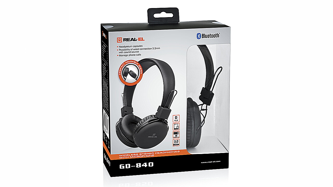 REAL-EL GD-840 wireless stereo headphones with microphone are designed for operation with mobile devices and other compatible systems by data transmission via Bluetooth protocol.
