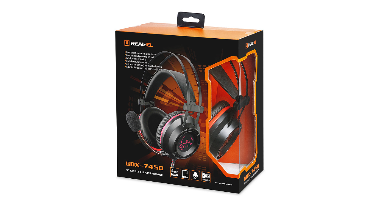 Headphones with a microphone REAL-EL GDX-7450 provide playback of powerful realistic sound, creating a sense of full immersion in the game. Compatible with media players and PCs.