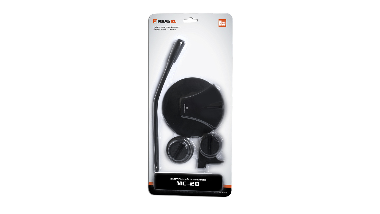 The REAL-EL MC-20 desktop microphone is designed for internet communication, recording words and phrases when studying foreign languages. The flexible stand, on which the microphone capsule is mounted, allows for adjusting the microphone position. The sturdy base provides stability for the model.