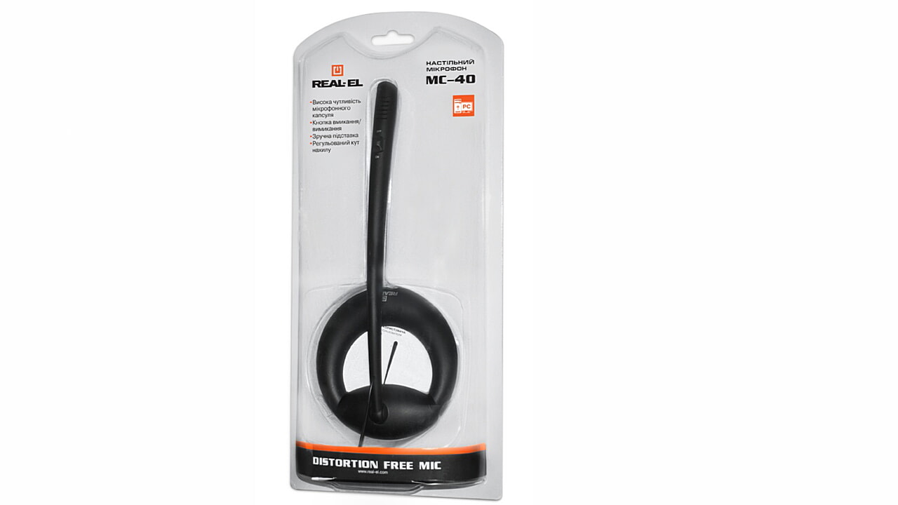 REAL-EL MC-40 desktop microphone is designed for online communication, recording words and phrases in foreign language learning. The stand hinge enables to change the tilt angle. The steady base provides good stability on a table.
