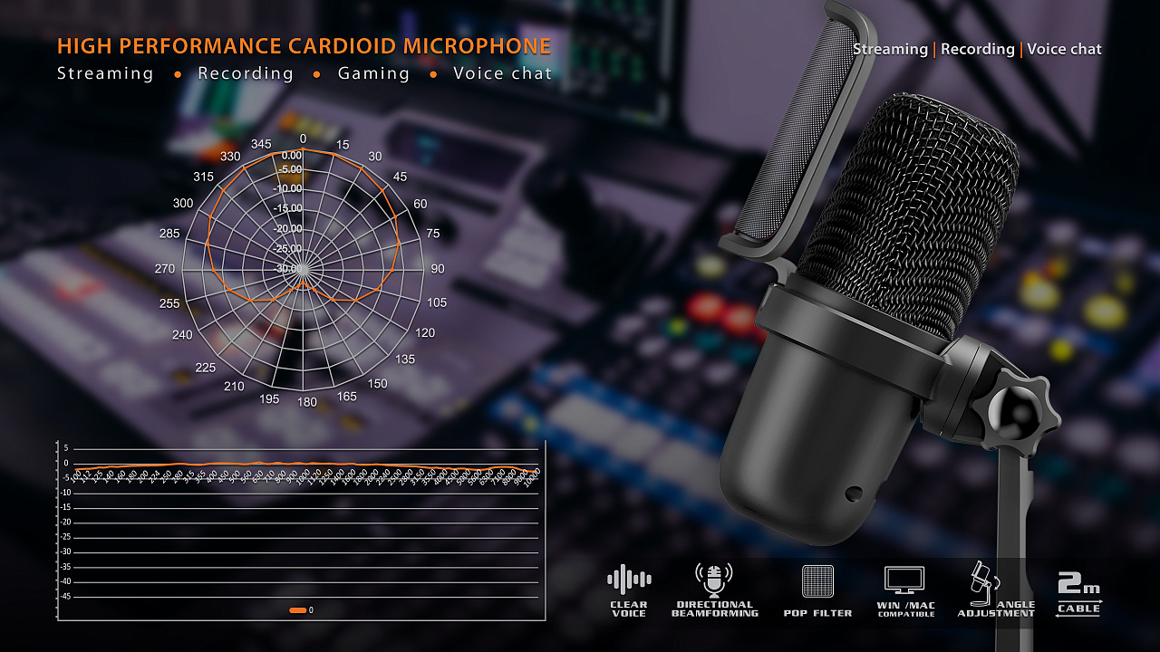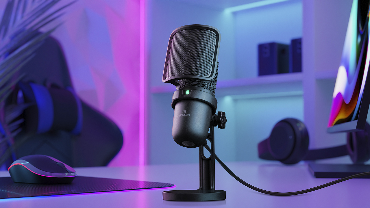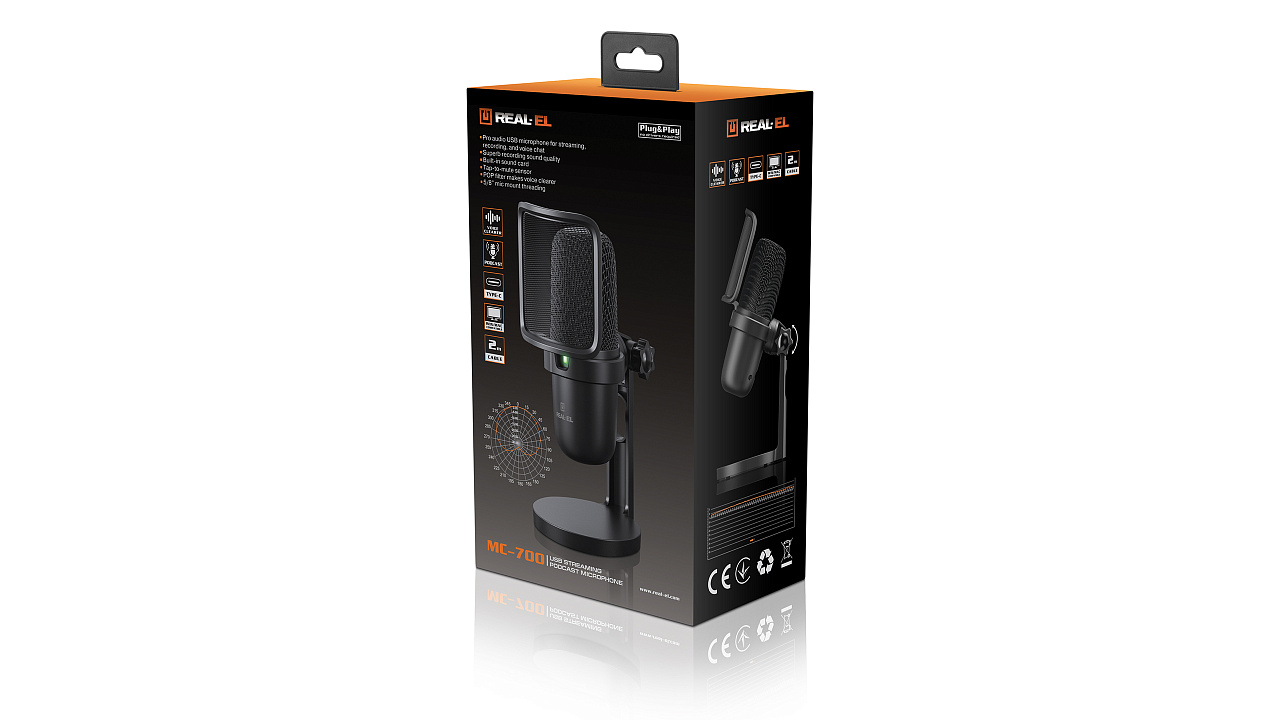 The professional audio microphone REAL-EL MC-700 is designed for live streaming, recording, and voice chat. Thanks to the built-in sound card and the presence of a POP filter, the MC-700 ensures high-quality sound recording.