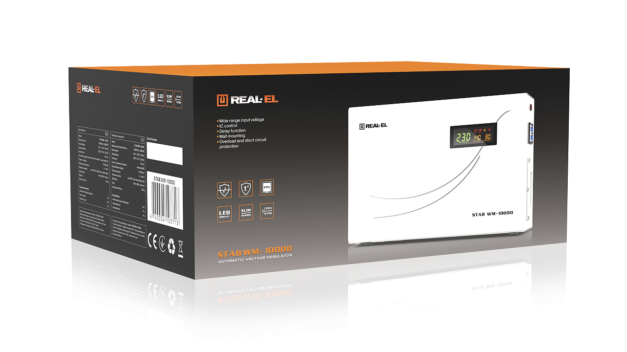 The REAL-EL STAB WM-10000 network voltage stabilizer is designed to provide quality and stable power supply to various consumers in conditions of significant and prolonged deviations in voltage from the nominal level, protecting consumer devices from overload and the effects of high-frequency interference.