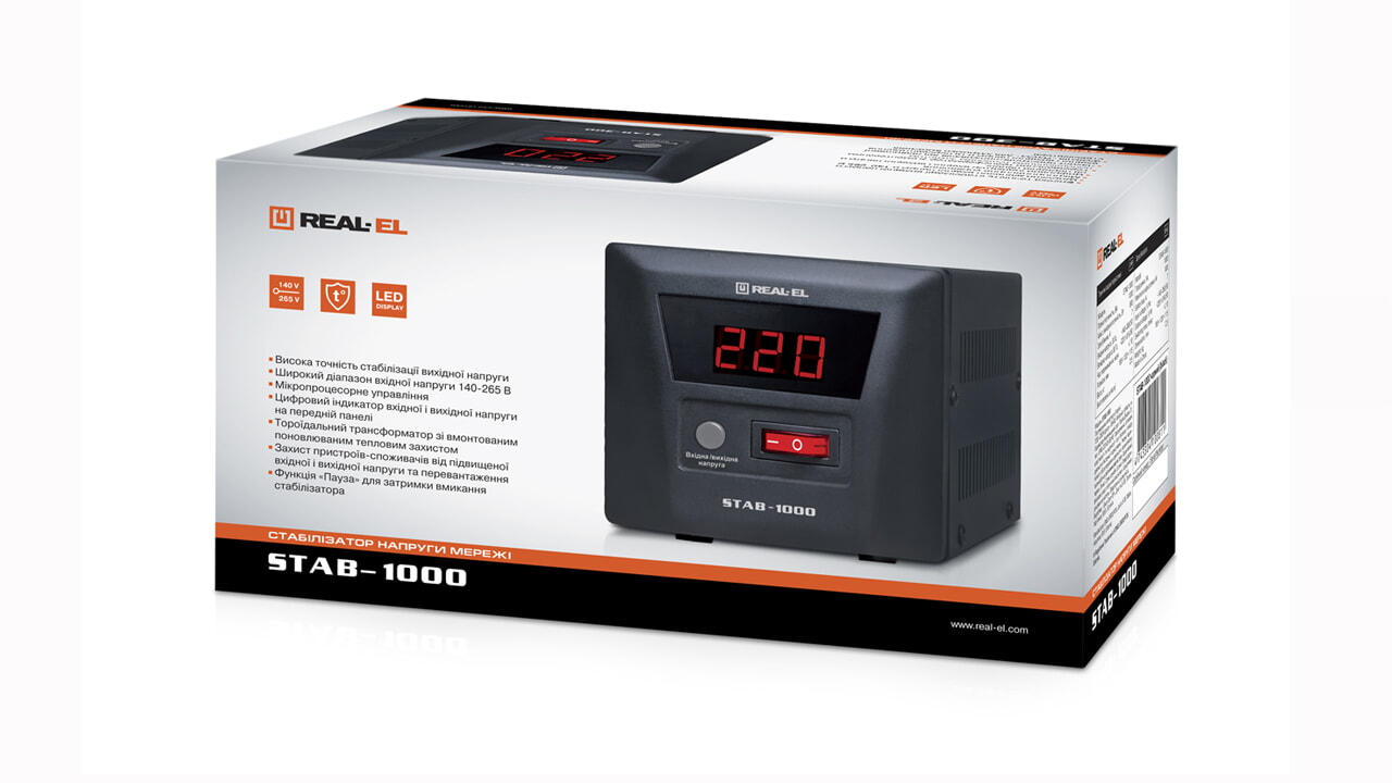 REAL-EL STAB-1000 automatic voltage regulator is designed for providing various equipment with high-quality stable electric power supply in conditions of significant and continuous deviations of mains voltage and protecting consumer devices against overload, influence of high-frequency and impulse interferences.