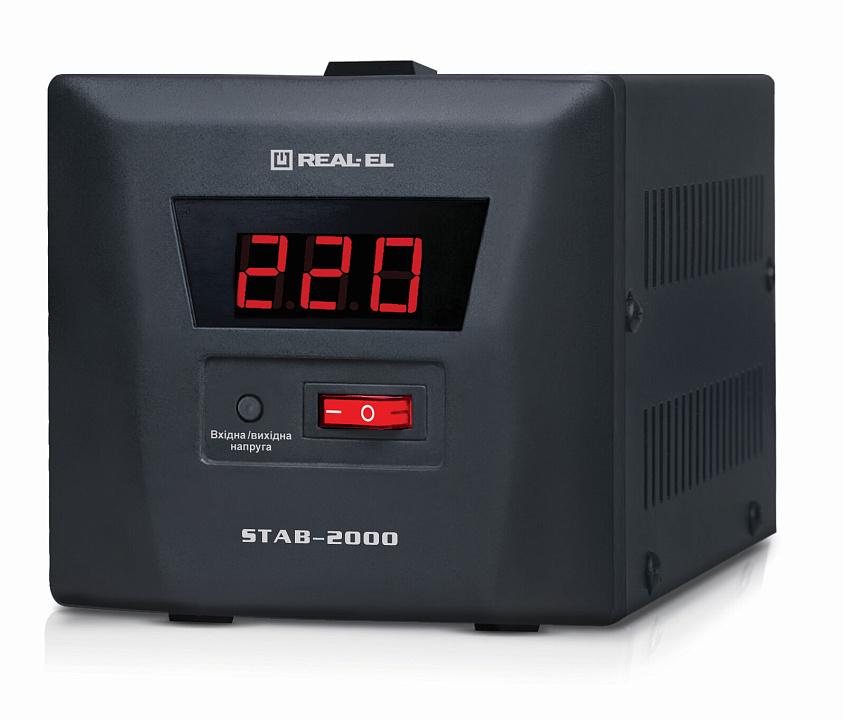 REAL-EL STAB-2000 automatic voltage regulator is designed for providing various equipment with high-quality stable electric power supply in conditions of significant and continuous deviations of mains voltage and protecting consumer devices against overload, influence of high-frequency and impulse interferences.