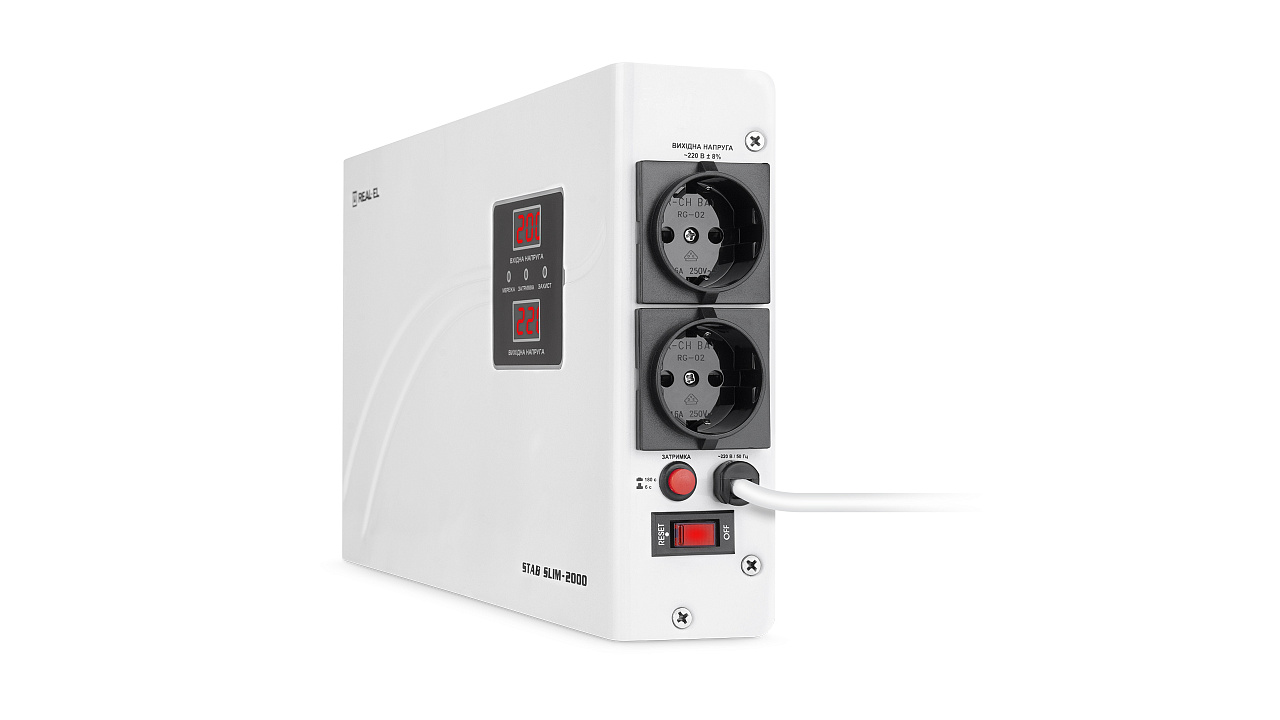 REAL-EL STAB SLIM-2000 voltage stabilizer is designed to provide quality and stable power supply to various consumers, protecting consumer devices from unacceptable voltage deviations, high-frequency, and impulse interference.