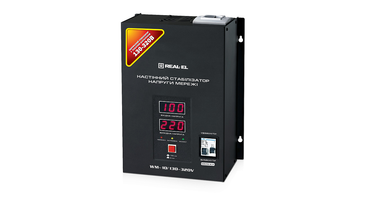 REAL-EL WM-5/130-320V automatic voltage regulator is designed for providing various equipment with high-quality stable electric power supply in conditions of significant and continuous deviations of mains voltage and protecting consumers-devices against overload and influence of high frequency interferences.