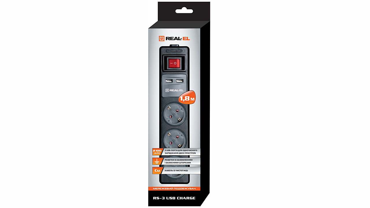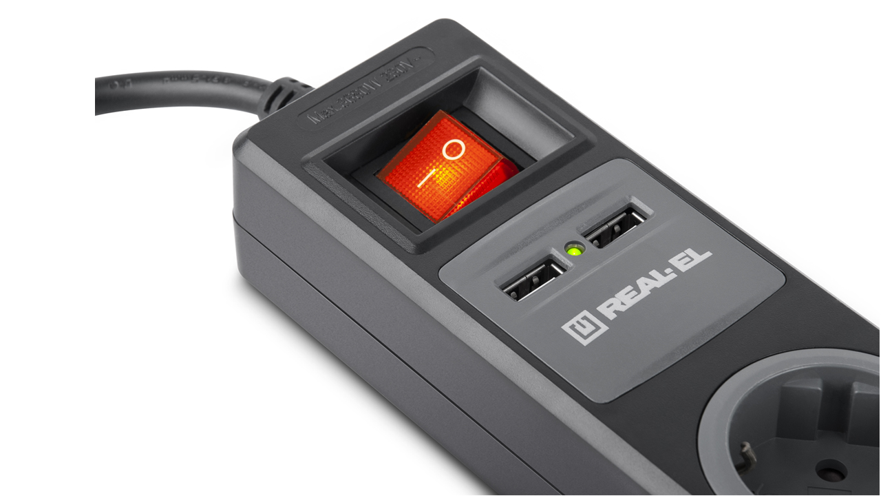 The REAL-EL RS-3 USB Charge power strip is a modern and multifunctional device that combines convenience and safety. It features three grounded outlets with protective shutters, as well as two USB ports for simultaneous charging of two devices. The overall double-pole switch with light indication provides additional safety and control. The cable is made of pure copper, ensuring high quality and reliability.