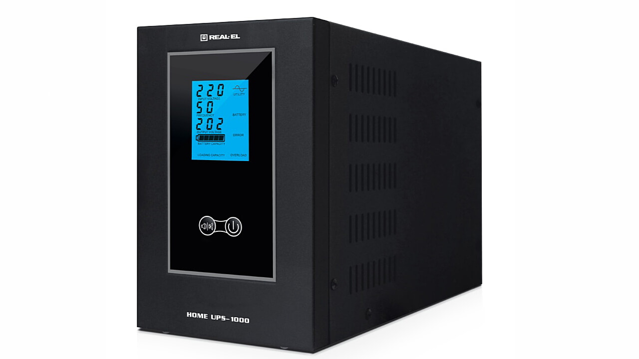 The REAL-EL HOME UPS-1000 line-interactive UPS of continuous action with long backup time for external batteries is designed to operate with lead-acid maintenance-free 12 V batteries of AGM type. Principle of their operation is based on the transformation of direct current of external batteries to alternating current. Current waveform at the output is the regular sinusoidal wave.