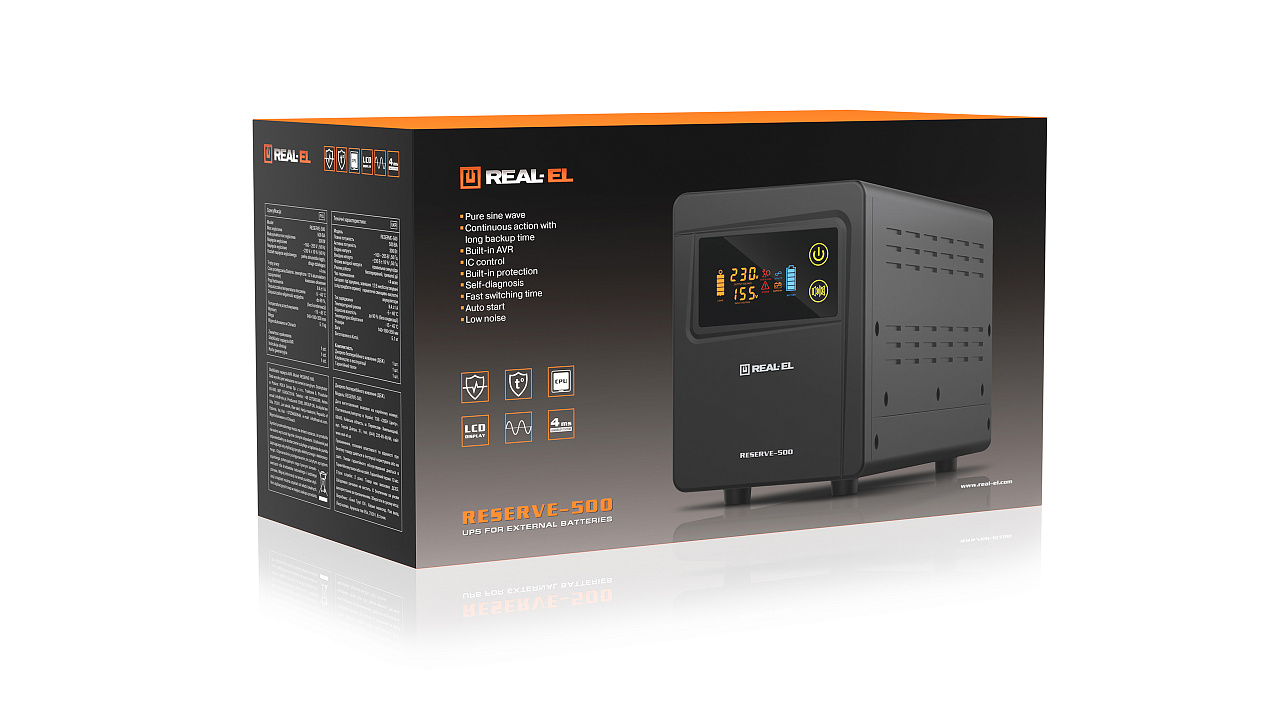 The line-interactive UPS of continuous operation with a long reserve time for connecting external batteries REAL-EL RESERVE-500 is intended for operation with lead-acid maintenance-free AGM batteries with a voltage of 12 V. Their principle of operation is based on converting the direct current of external batteries into alternating current. The output current waveform is a pure sine wave.